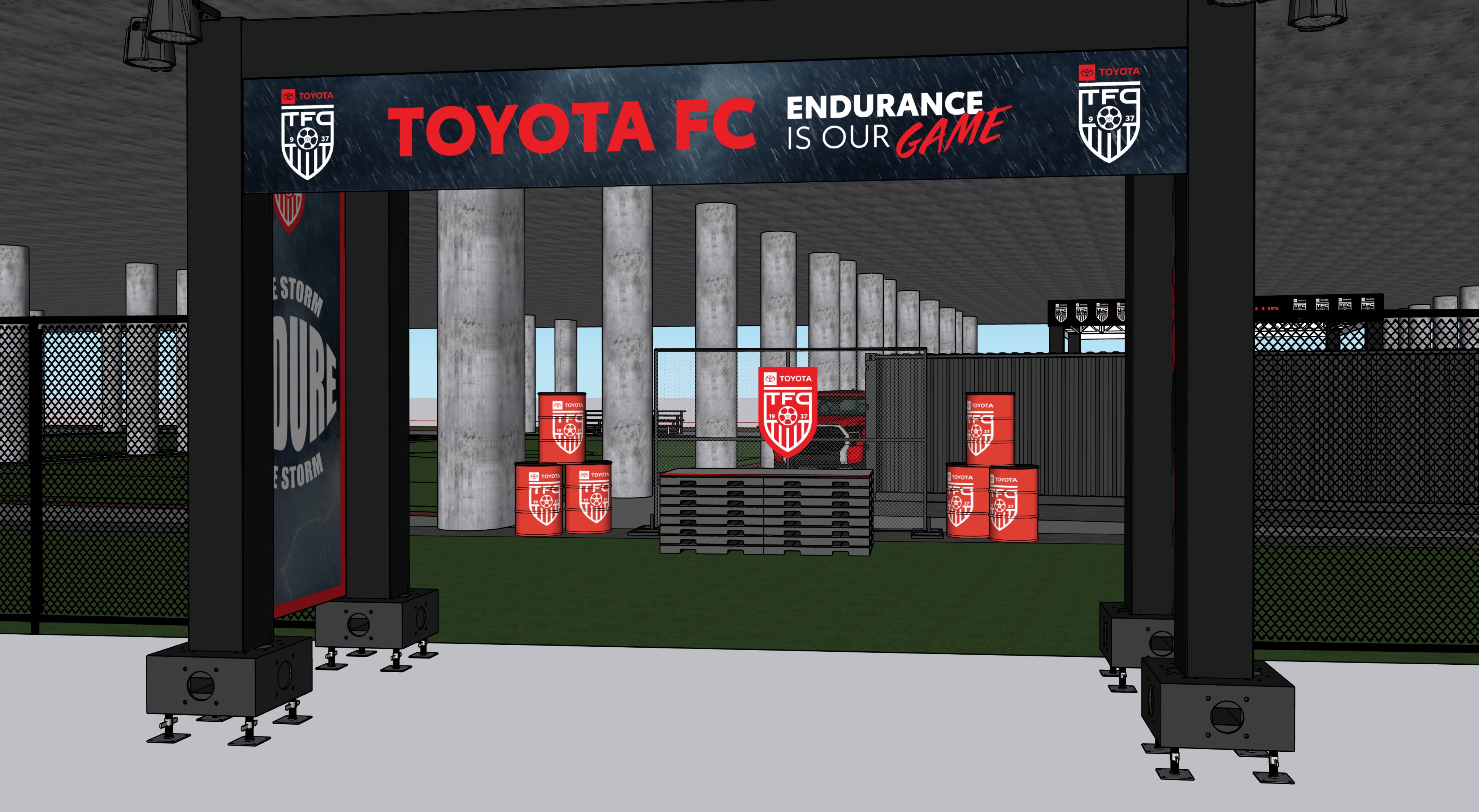 render a detailed hyper realistic scene featuring a collection of objects in an industrial setting highlight vibrant red oil barrels with logos ensuring the red is bold and striking capture a metallic silver refrigerator with glass doors reflecting light for a glossy finish surround the scene with black crates accentuated by red bands creating a contrast with their deep matte texture set this in a spacious environment with soft diffused daylight filtering in creating a clean modern industrial atmosphere ensure shadows and reflections are crisp and well defined enhancing the overall depth and realism add and soccer trophies on the table and put props on the fence