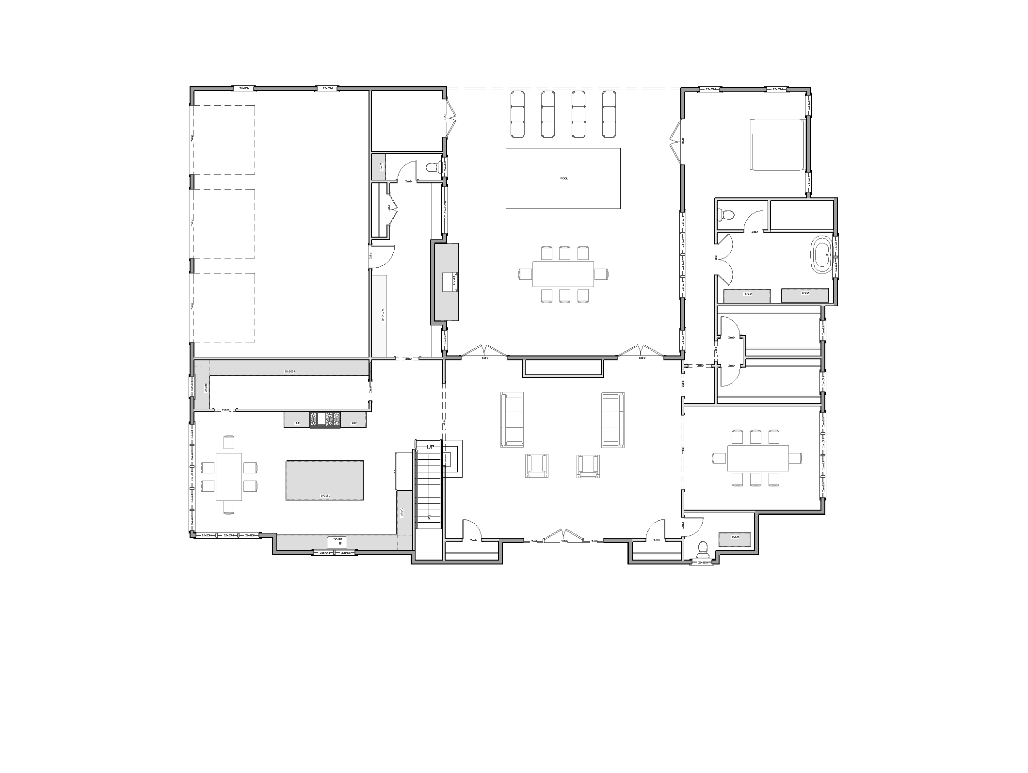 floor plans for a high end custom home approximately 4 500 5 000 square feet overall layout u shaped layout creating a private rear courtyard front center portion of the home is two stories left and right wings are single story extending toward the rear to form the u courtyard should feel proportionally balanced and private not long and narrow strong indoor outdoor connection from main living areas to courtyard garage attached 3 car garage side load preferred garage should connect to a mudroom with built ins include space for storage and optional workshop area program requirements 5 bedrooms total all bedrooms must have ensuite bathrooms primary suite located on the first floor in one of the private wings for privacy 1 or 2 powder rooms on the first floor one near main living areas for guests optional second powder room near mudroom back entry main floor open concept kitchen dining and great room oriented toward the courtyard with large sliding or folding glass doors kitchen to include large island walk in pantry and optional prep kitchen scullery dedicated office study mudroom with built ins connected to attached garage covered outdoor living area with fireplace outdoor kitchen optional small plunge pool centered in courtyard upper level only in the two story front section 2 3 secondary bedrooms with ensuite bathrooms optional loft lounge space overlooking foyer or courtyard optional bonus media room architectural style transitional symmetrical front elevation clean rooflines large windows facing courtyard deliverables fully dimensioned floor plan furniture layout for scale front exterior rendering courtyard rendering