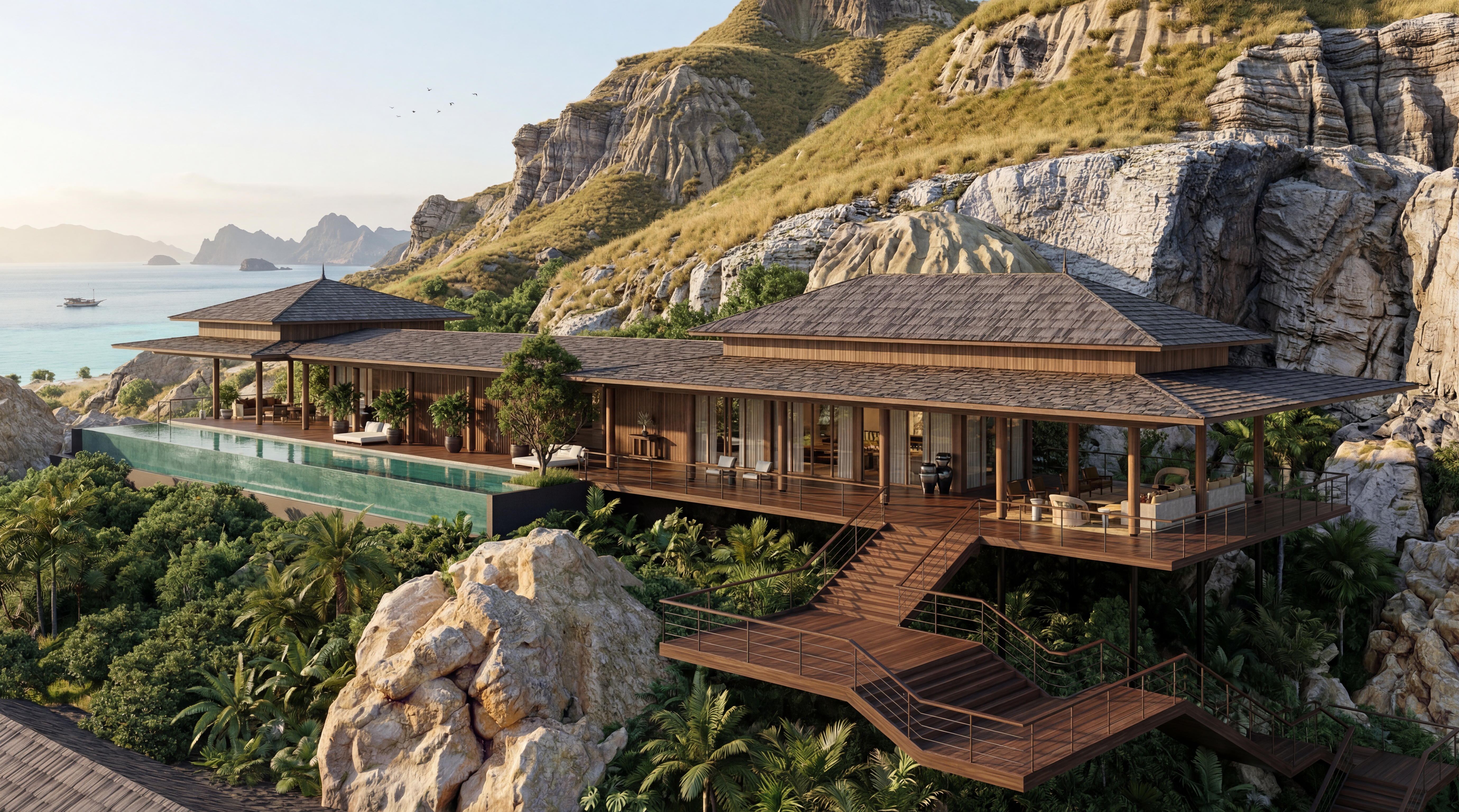 walls and ceiling are warm off white limewash vanity stone is soft muted light emerald quartzite vanity cabinetry is a soft muted mid tone timber not dark not light glass door is bronze frame with flemished textured glass insert moody lighting golden hour turn wall sconces on wall sconces are an amber toned murano glass wall behind toilet is same quartzite and above toilet the wall is a mirror panel with no joints timber flooring no knots bedroom window has soft white linen curtains