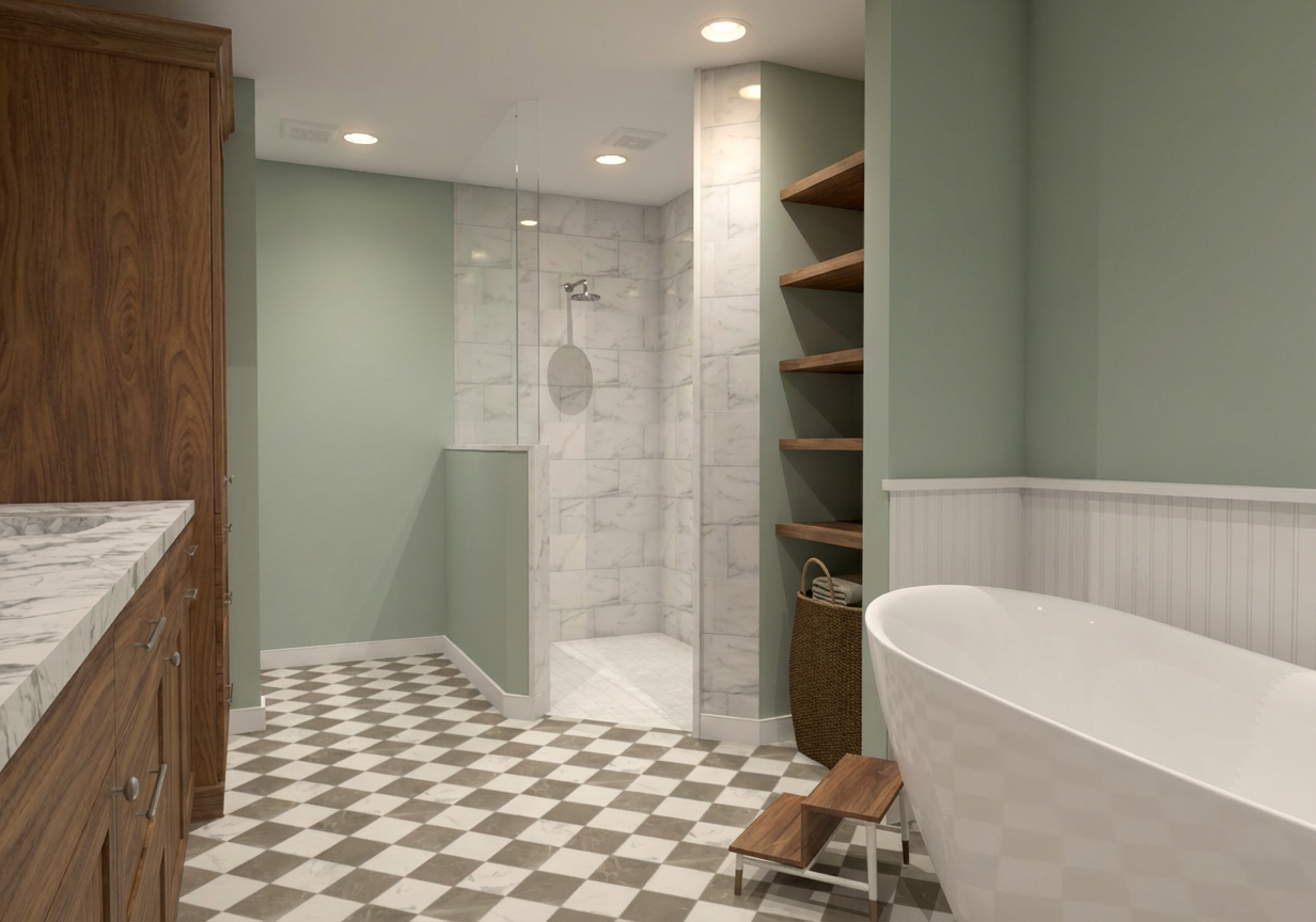 photorealistic interior rendering of the provided kitchen model preserve the exact architecture layout cabinetry design beam placement stone layout and camera angle do not add remove or relocate any elements target mood elevated moody high end european country house rich warm atmospheric not bright not flat not builder grade lighting low warm ambient light with strong directional sunlight entering from windows at a low angle create contrast with areas of shadow and highlight no overexposure no washed out whites maintain depth and chiaroscuro color temperature 2700k 3000k add subtle under cabinet lighting with warm diffused glow and soft falloff add warm interior lighting inside glass cabinets with a dim amber glow pendant lights softly glowing not dominating materials countertops must remain exactly the same color and material as modeled honed finish add depth subtle reflection and natural variation no brightening or color shift stone must match creemore estate blend weatheredge limestone irregular edges varied tones cream tan soft gray visible depth in joints slight shadowing between stones avoid uniformity and avoid smooth or modern stone appearance wood all wood elements to read as natural aged character grade wood visible grain variation knots subtle checking tonal inconsistency matte hand finished appearance island wood slightly richer and deeper in tone than perimeter cabinetry avoid flat desaturated or overly clean wood beams keep exact placement render as reclaimed hand hewn white oak heavy texture tool marks cracks irregular edges darker aged patina matte finish no new beams cabinetry painted cabinetry in a warm muted neutral soft cream stone tone slight depth and undertone variation no stark white no green cast avoid flat paint introduce subtle shadowing and dimension at panel edges atmosphere introduce subtle ambient occlusion in corners under cabinets and where materials meet soft dusting of light in air for realism slight vignette effect from natural light falloff overall scene should feel grounded intimate and layered avoid bright and airy look cool lighting flat or uniform materials glossy finishes builder grade simplicity maintain exact geometry and proportions do not reinterpret design