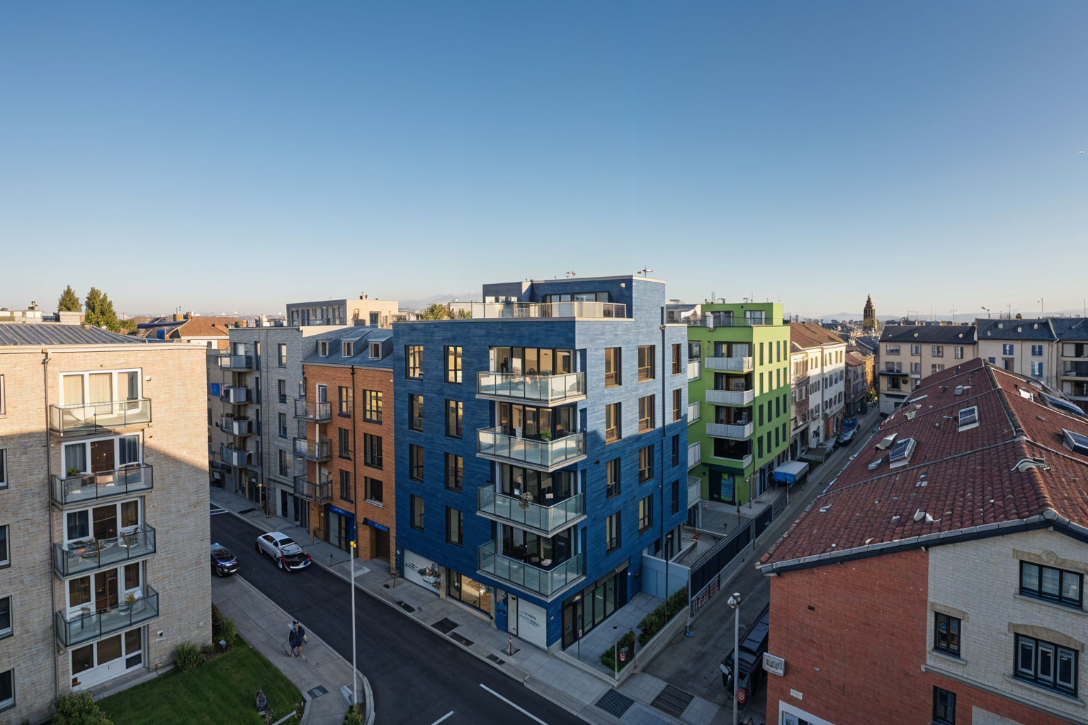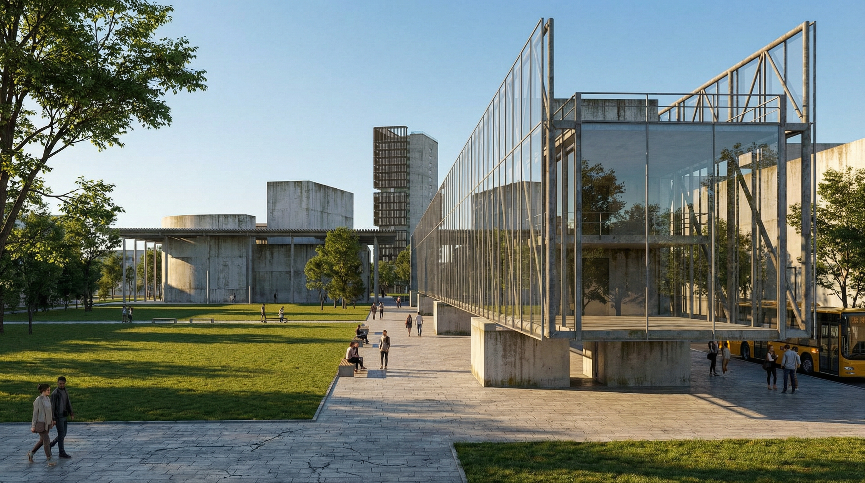 show people sitting standing on the steps of the outdoor auditorium in a beige grassy environment around it