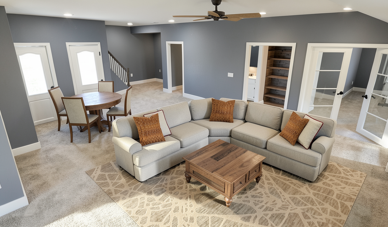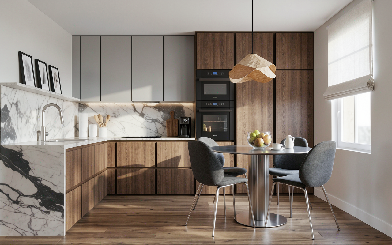 instruction refine the image while preserving composition materials lighting and camera focus only on correcting lighting and furniture proportions lighting correction critical remove any led strip lighting under upper cabinets no artificial linear lighting in the kitchen keep only natural daylight from the window ambient light must remain soft and indirect no hidden lighting sources table scale correction very important adjust dining table to realistic residential scale table must feel compact and proportionate to 4 chairs diameter approximately 90 100 cm height standard dining height 75 cm reduce visual dominance table should not be the main focal point ensure correct spatial relationship comfortable distance between table and kitchen chairs properly tucked under table natural circulation space chair proportion refinement maintain corrected realism no inflated look ensure scale matches table no oversized seating global balance kitchen remains the main visual weight dining area secondary lighter presence maintain harmony between elements restrictions critical do not change layout or camera do not modify materials or colors do not add lighting elements do not restyle scene
