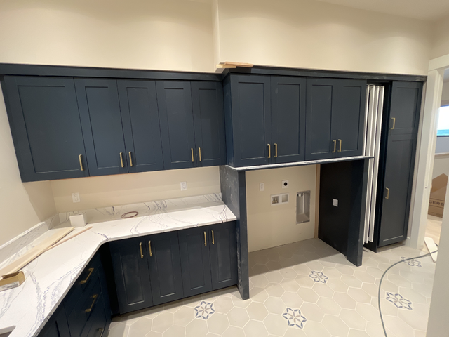 do not change the cabinets in any way preserve the exact cabinet colors materials finishes dimensions door and drawer styles hardware spacing alignment and all geometry exactly as shown do not alter the countertop shape backsplash appliances flooring lighting fixtures or wall structure only remove the construction materials clutter and mess from the scene clean the room and make it look finished and staged add a few simple tasteful home accessories appropriate for the style of the space but do not add or remove any furniture windows or architectural elements maintain the original lighting direction and realism enhance clarity and polish the photo while keeping the cabinetry and room design completely unchanged do not alter the lighting to keep the cabinet colors as they are in the image stage this as a laundry room with a washer and dryer on pedestals