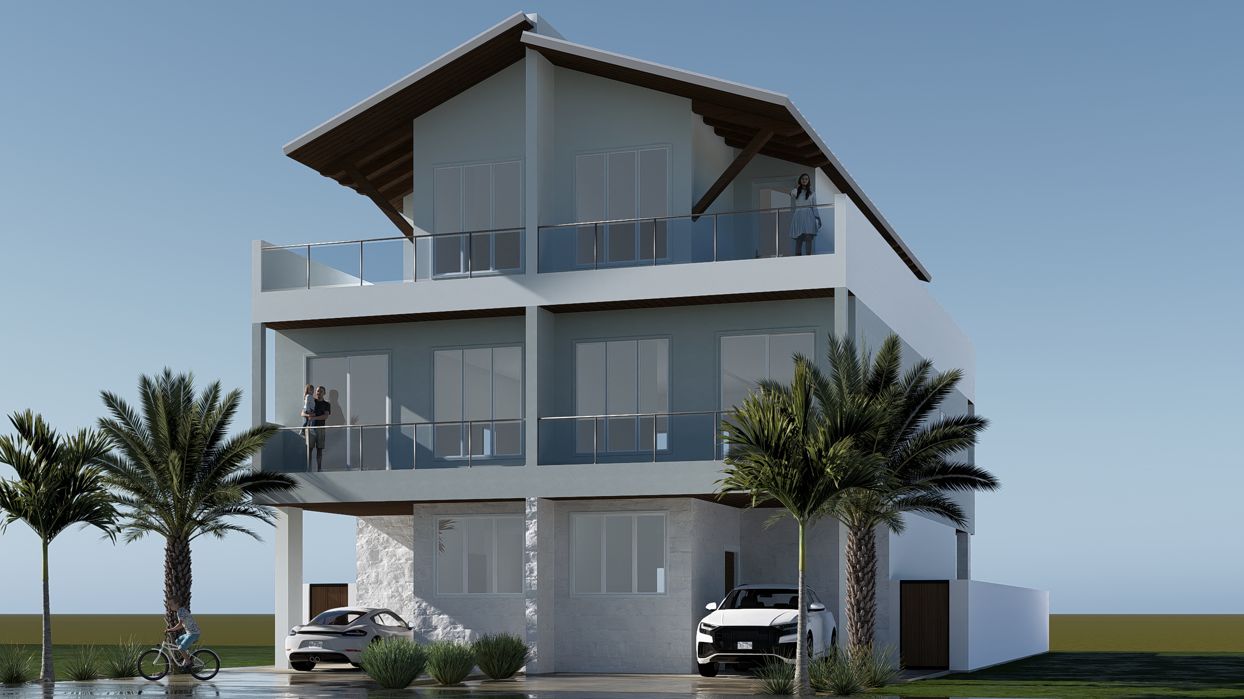 place the house in a coastal neighborhood surrounded by beach houses dont add any bay or beach areas keep all colors and finishes the same as the uploaded image