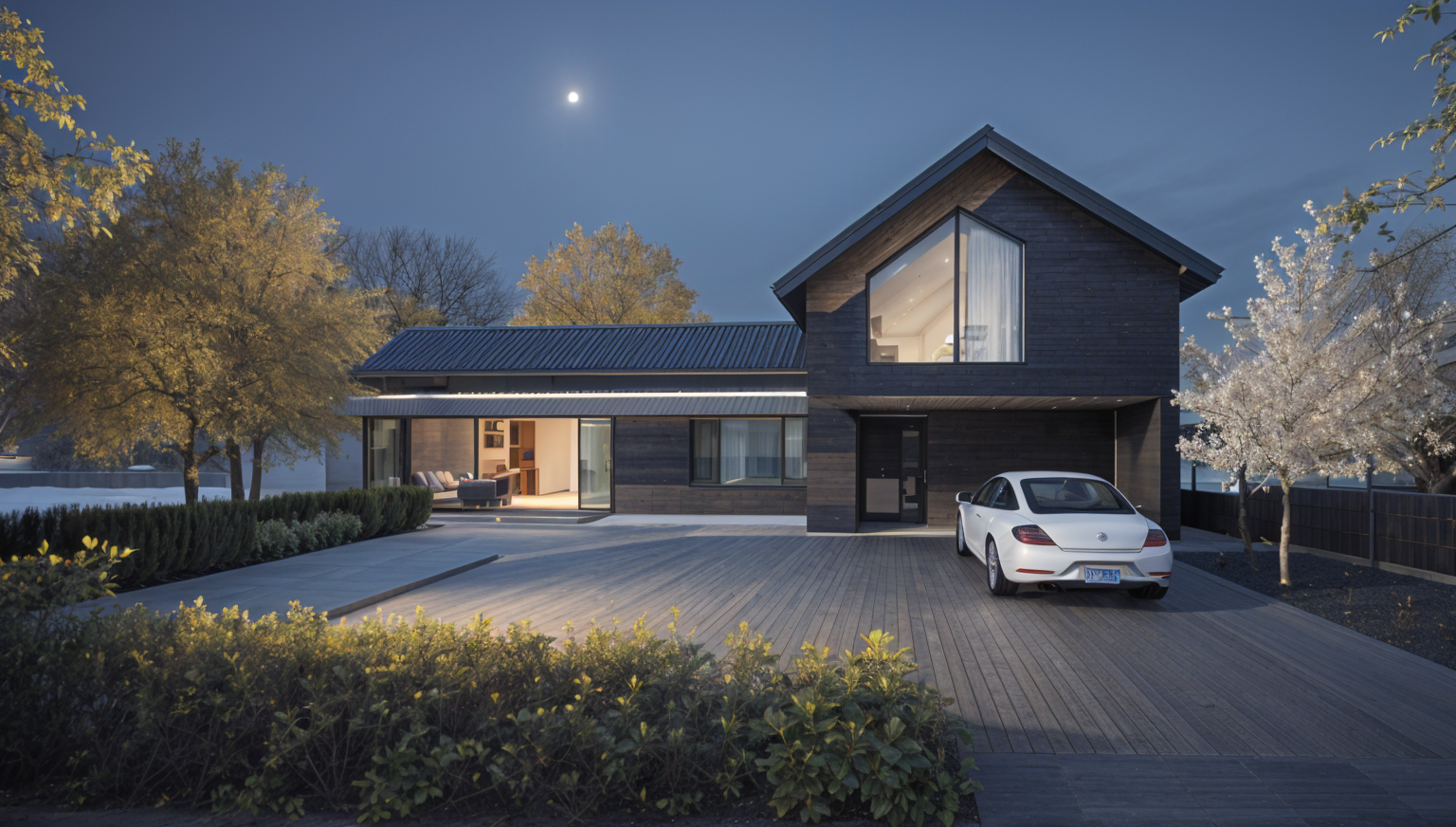 exterior shot a beautifully rendered modern kitchen interior with a serene and cozy atmosphere the walls are crisp white the floor has a light oak wood texture the minimalist kitchen cabinets are pure white with a glossy finish the bar stools feature a dark wooden base with beige cushions the console table is a light natural wood complementing the woven basket underneath the table lamp has a soft beige shade and the vases are matte white and soft terracotta a blue sky ans ocean view on the horizon is visible through the window bringing in natural light a large round jute rug and modern grey soft overall the ambiance is modern inviting and harmonious with neutral and warm tones