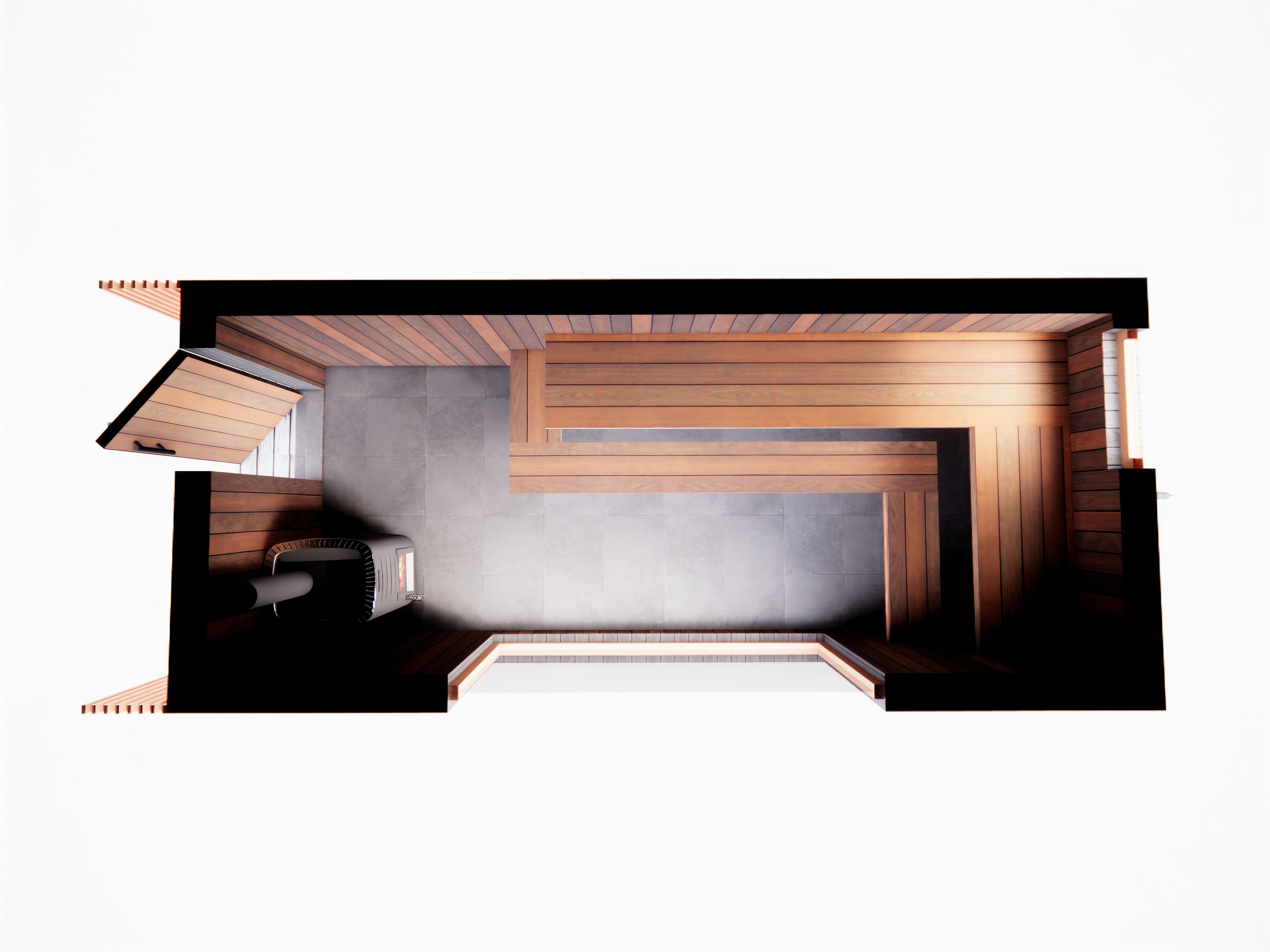 render a photorealistic 3d perspective of this sauna the current material style keep model geometry the same windows doors roof sky with light atmospheric depth render in hyper realistic architectural visualization quality 8k resolution