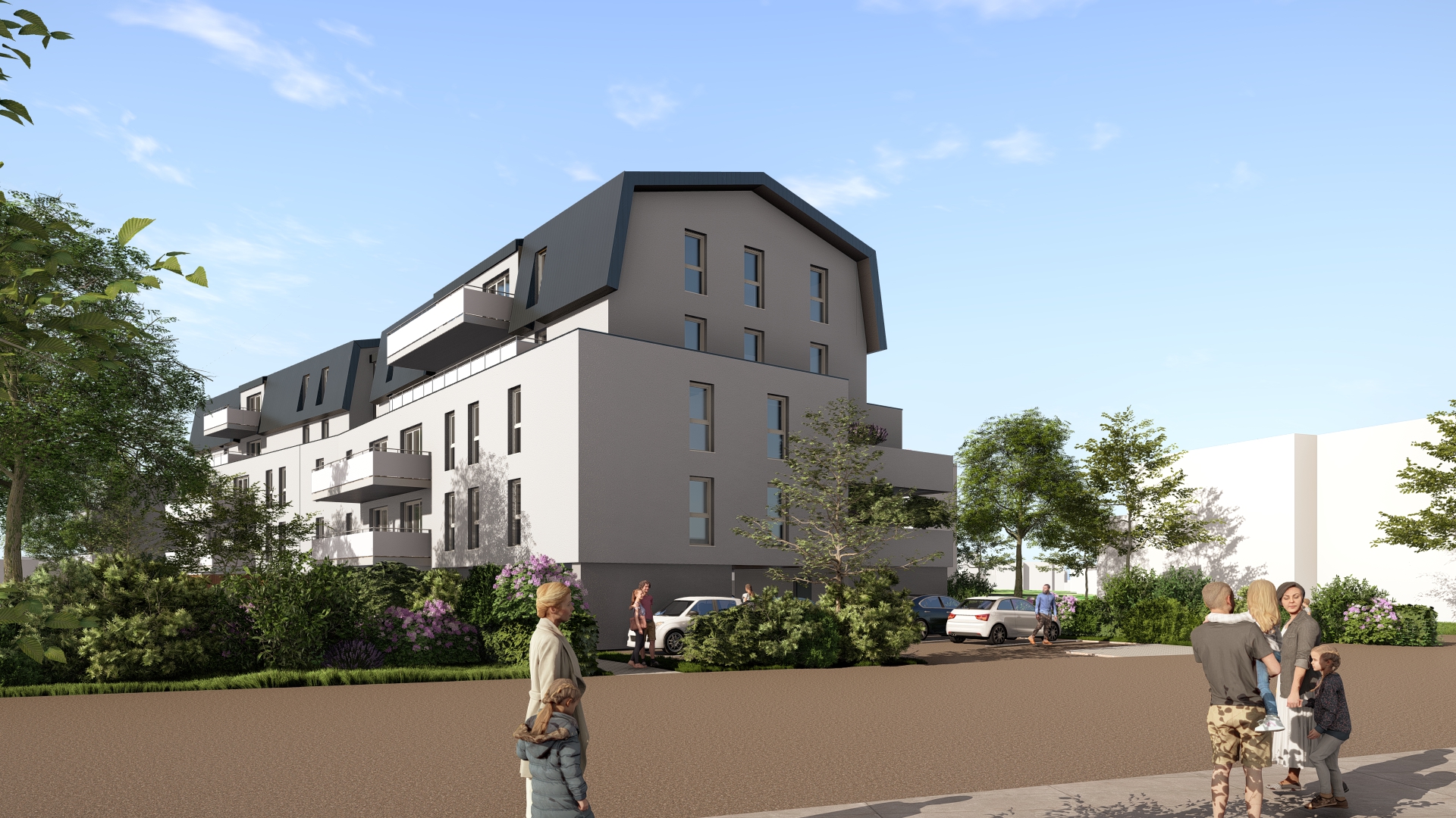 colonial revival exterior shot modern apartment building with a sleek design dark gray zinc roof white and warm gray facade and geometric balconies bright sunlight casts gentle shadows creating a welcoming atmosphere lush green trees and bushes line the sidewalk providing contrast with the building a serene blue sky with wispy clouds enhances the tranquil urban setting architecture