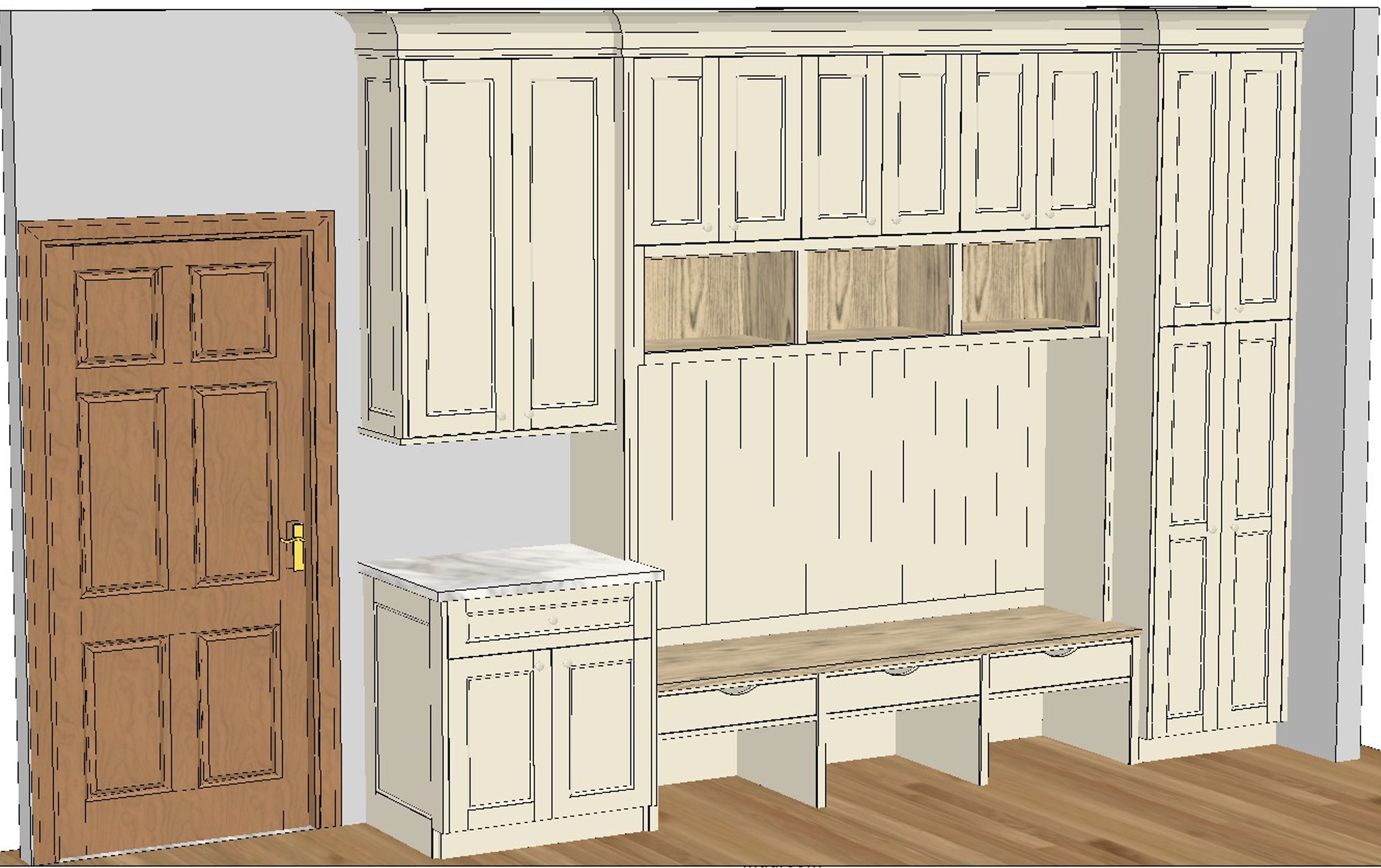cabinets are sw white duck with a light white oak bench and cubbies no natural light so create soft artificial light but keep it bright