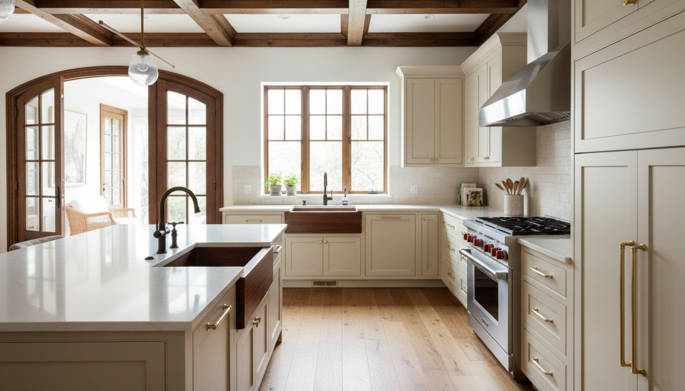 make the cabinets shaker style in a dark gray color make the countertops butcherblock paint the walls and ceiling iron ore by sherwin williams make the facuet and cabinet pulls modern black make the backsplash a white quartz seamless