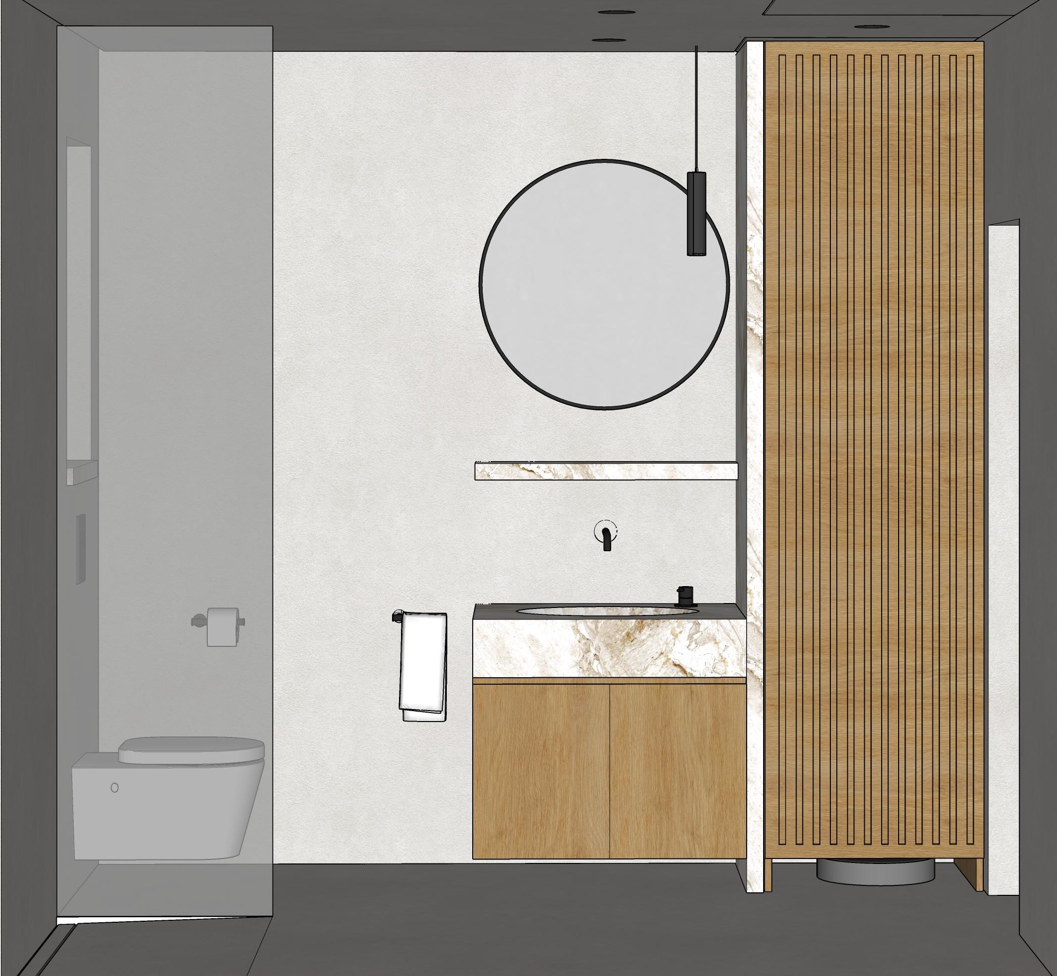 photorealistic image minimalistic scandinavian style bathroom walls and floor from light white beige microcement washbasin from beige marble cabinet from natural bright oak veneer light coming from window on the left