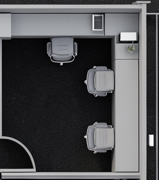 modern surveillance camera room interior front elevation view feature wall with a grid of 15 wall mounted monitors arranged in clean rows and columns fitting into the size of the wall ultra thin bezels all screens aligned symmetrically minimalist high tech control room design continuous built in desk spanning the full width of the wall in matte light grey finish sleek and flush design with no visible handles two workstation setups centered along the desk each with ergonomic light grey seating chairs featuring black metal legs black flooring with a smooth matte finish subtle reflections integrated cable management for a clean look soft ambient lighting with indirect led illumination professional control center atmosphere neutral color palette light grey black and white tones sharp lines balanced composition photorealistic rendering 4k resolution modern corporate tech environment