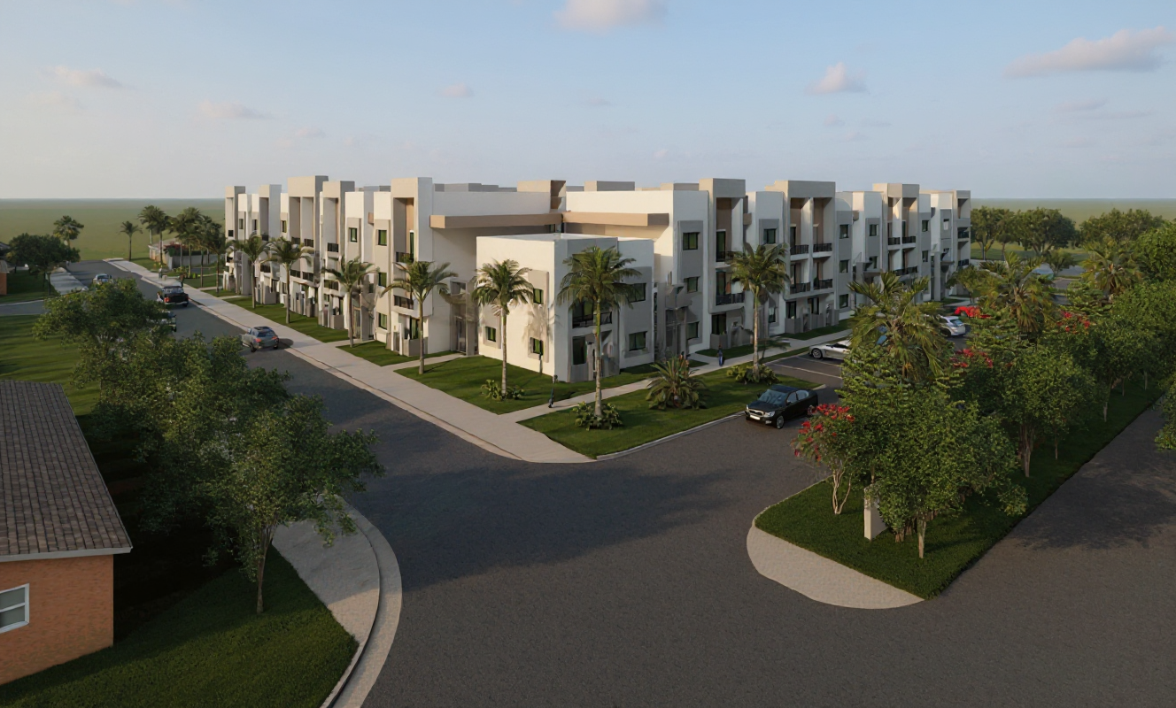 exterior shot photo realistic rendering with white beige and toupe stucco black roof black window frames lawn low timber deck extensive native planting background trees daytime
