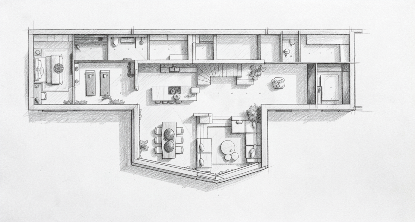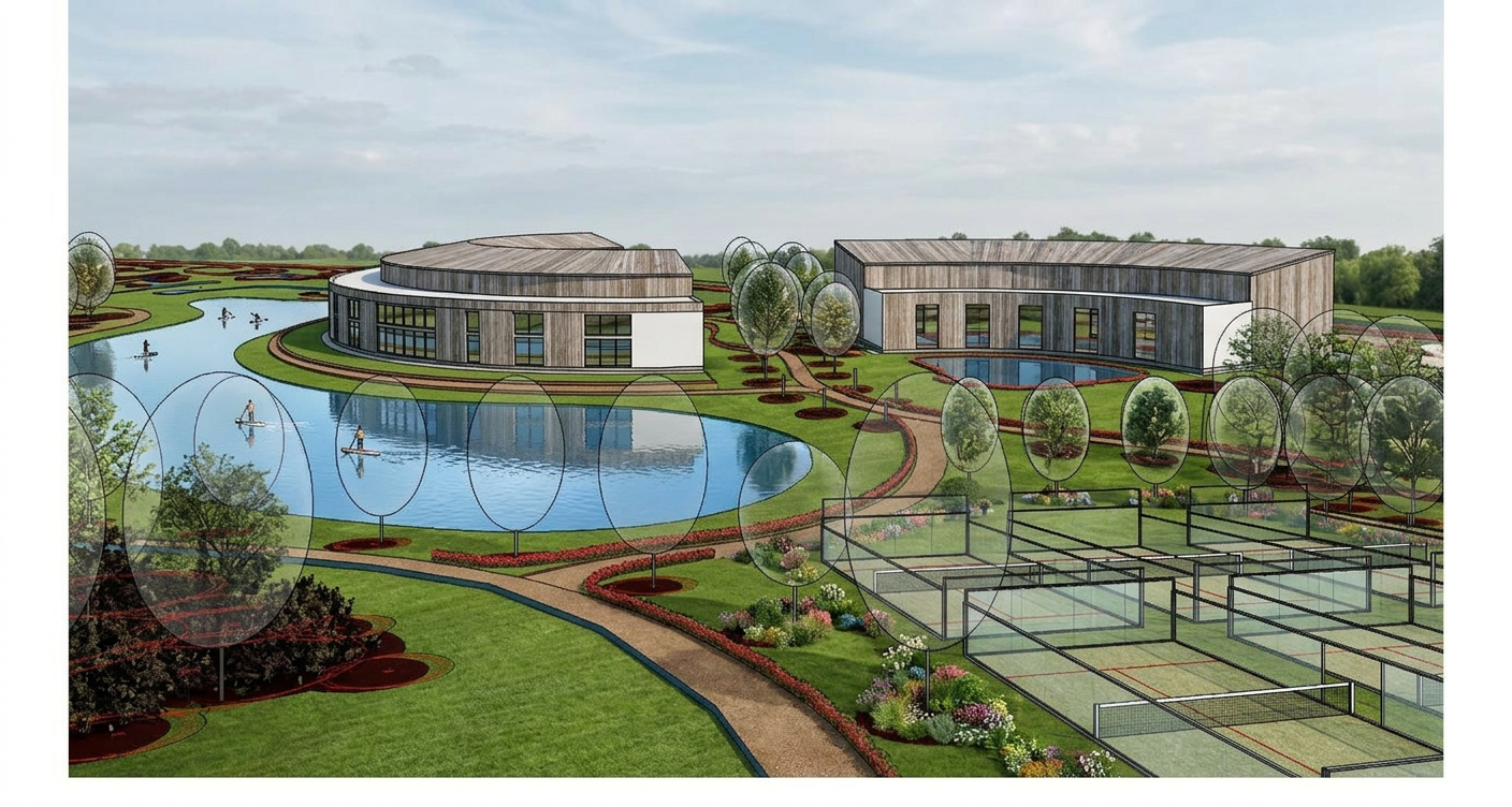 render a beautifully detailed aerial view of a vast landscape the area is intricately planned with winding paths and lush greenery use a palette of muted greens for the fields and darker shades for the dense woodland the ponds and water features should be realistic blues with reflections of the sky and buildings and a ripple in the water there are paddle boarders on the water incorporate earthy browns for pathways infuse the image with a balanced natural atmosphere capturing both tranquility and the vibrant life of a countryside the two buildings to the rear are a mix of timber cladding and small amounts of white render with large glazing reflecting the scenery to the front right of the image there are 6 padel courts with the walls made from glass various colourful planting and shrubs scatter the grass and along the paths