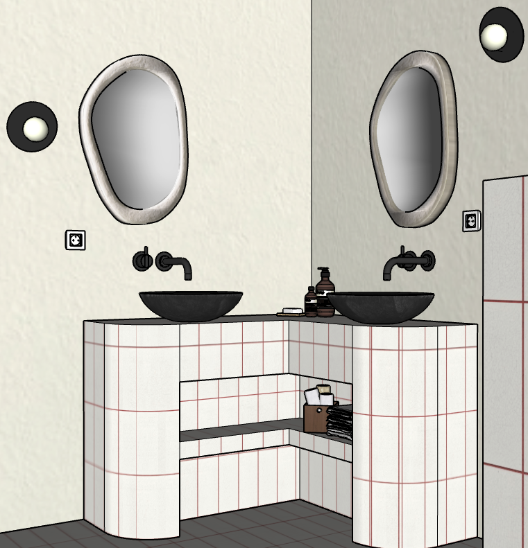 photo realistic bathroom respect proportion natural light from the window and soft and warm light from the lamps on the wall