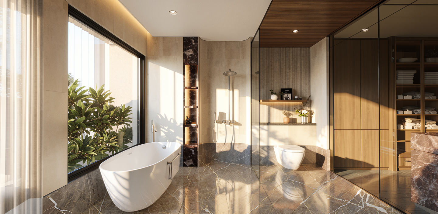 a modern suburban house with clean lines featuring a minimalist design the house has light gray walls with a smooth texture and a rich terracotta red tiled roof the windows and doors are sleek black with a matte finish the front yard is lush with vibrant green grass and a neat stone pathway leads up to the entrance tall dense green hedges line the background adding privacy and a touch of nature the atmosphere is serene and welcoming with a bright blue sky and soft diffused sunlight the ground has a smooth gravel texture providing a subtle contrast to the greenery