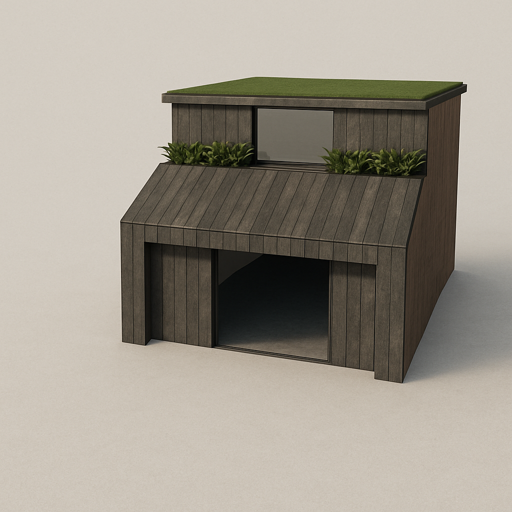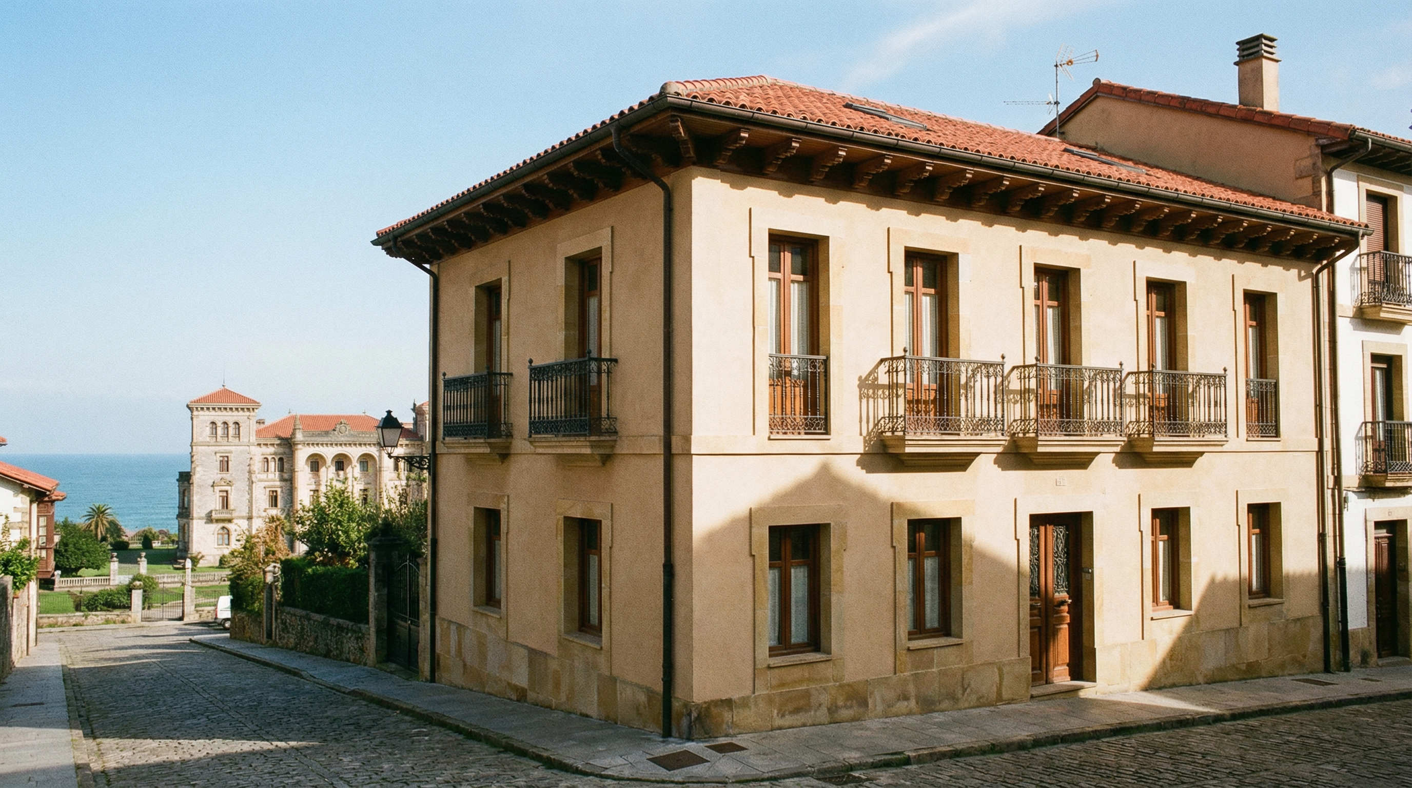 modernist exterior shot una casa en comillas con cubierta de tejas rabes rojizas enfoscado de mortero color arena recercados de las ventanas en el mismo material que en la fachada y contraventanas en color verde ral 7044 con rodapi en fachada de 40 cm de alto balcones con barandillas de hierro antiguos y cerchas de madera y alerones de barro antiguo combinados con madera color casta o architecture