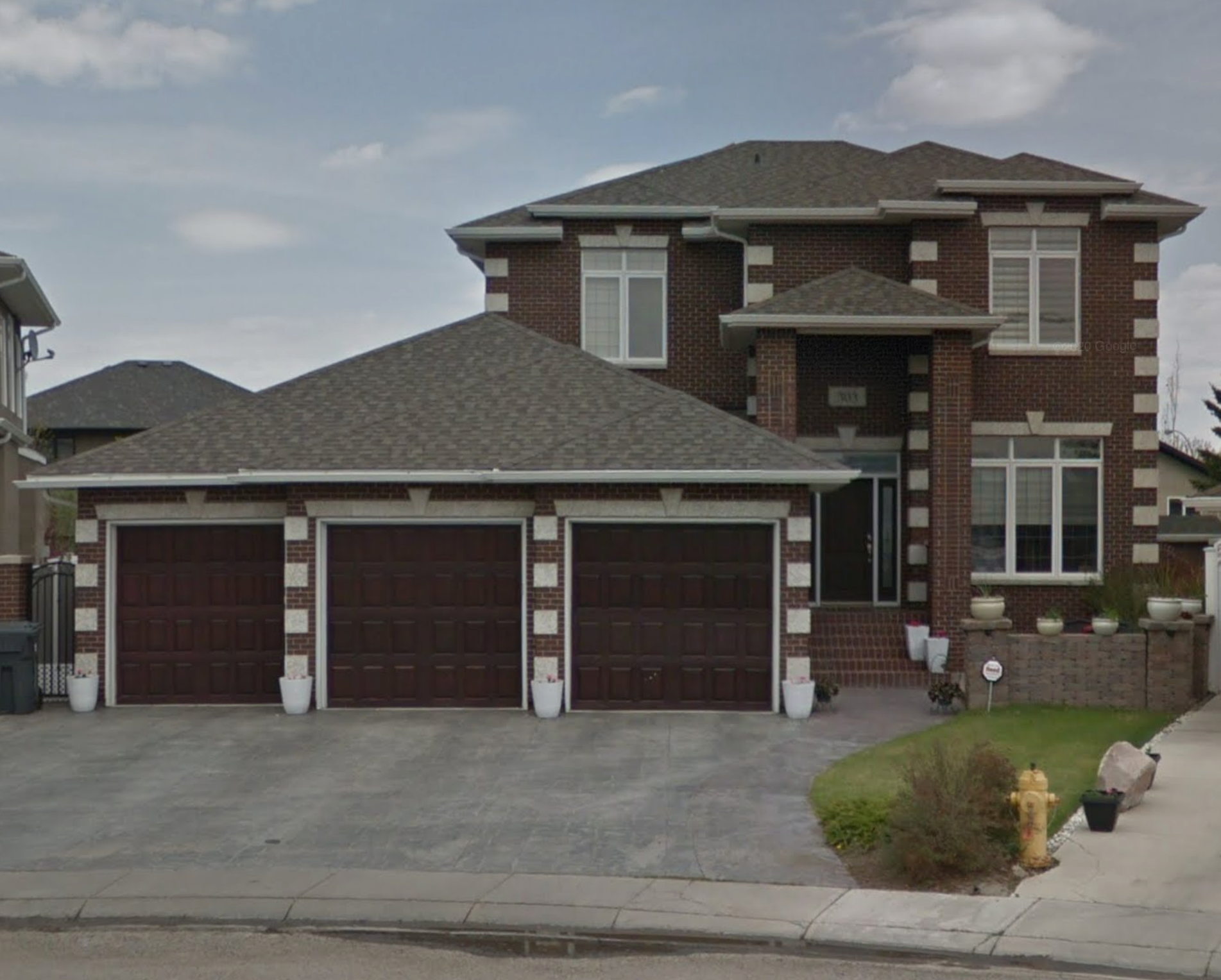 create a timeless front facade set in an open prairie setting with lush trees and neighboring houses in the background offwhite board and batten off white warm stone warm white stucco brown shingles walnut door with beige fascia add a sprawling ashpalt driveway in front and to the right side as well zoomed in a bit