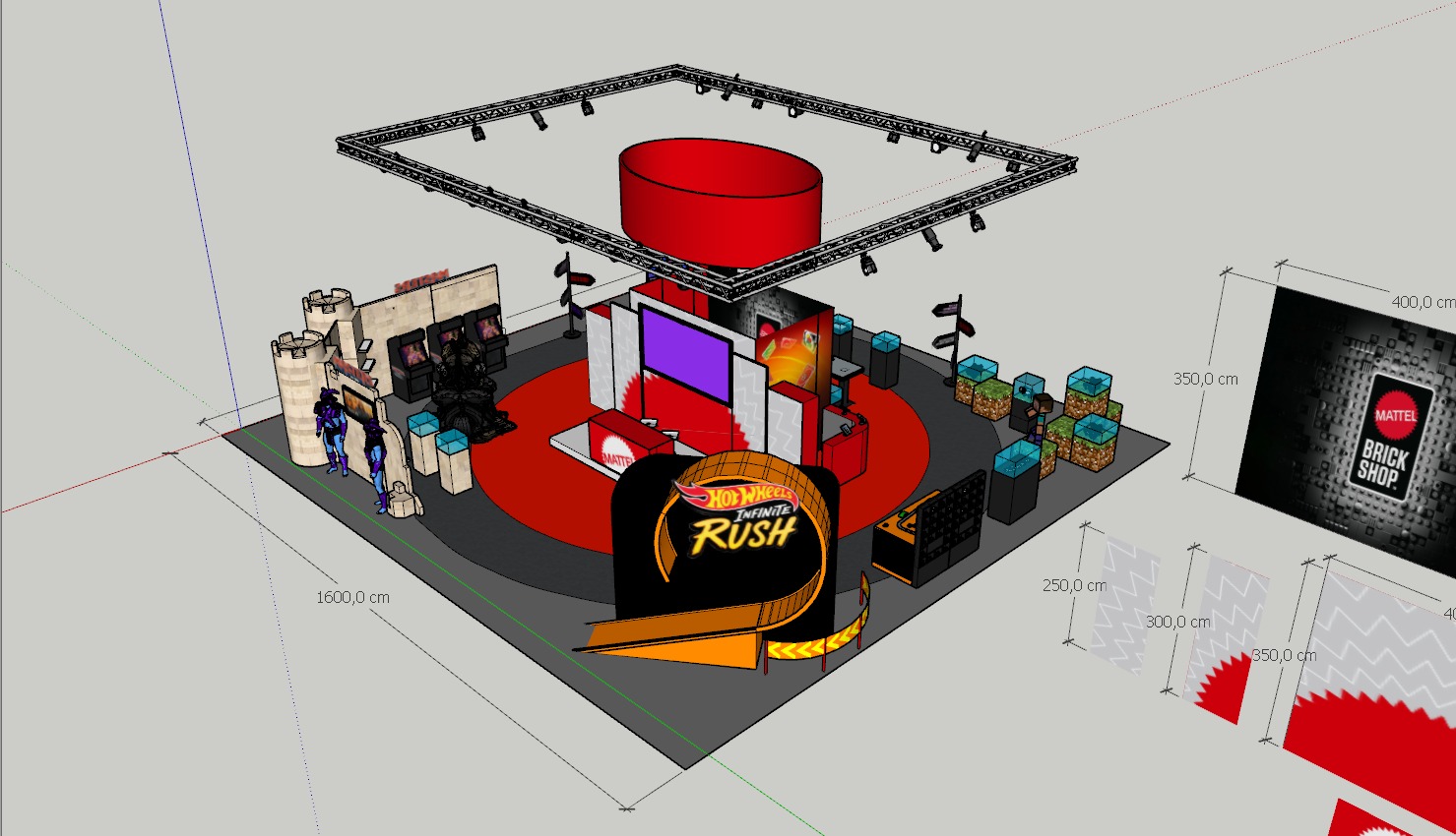 trade fair exhibition hall large industrial pavilion with high ceiling overhead truss lighting system led spotlights busy fair atmosphere with visitors in background other stands visible in distance concrete floor with booth carpet realistic photography style natural and artificial mixed lighting sharp details photorealistic render 35mm lens depth of field
