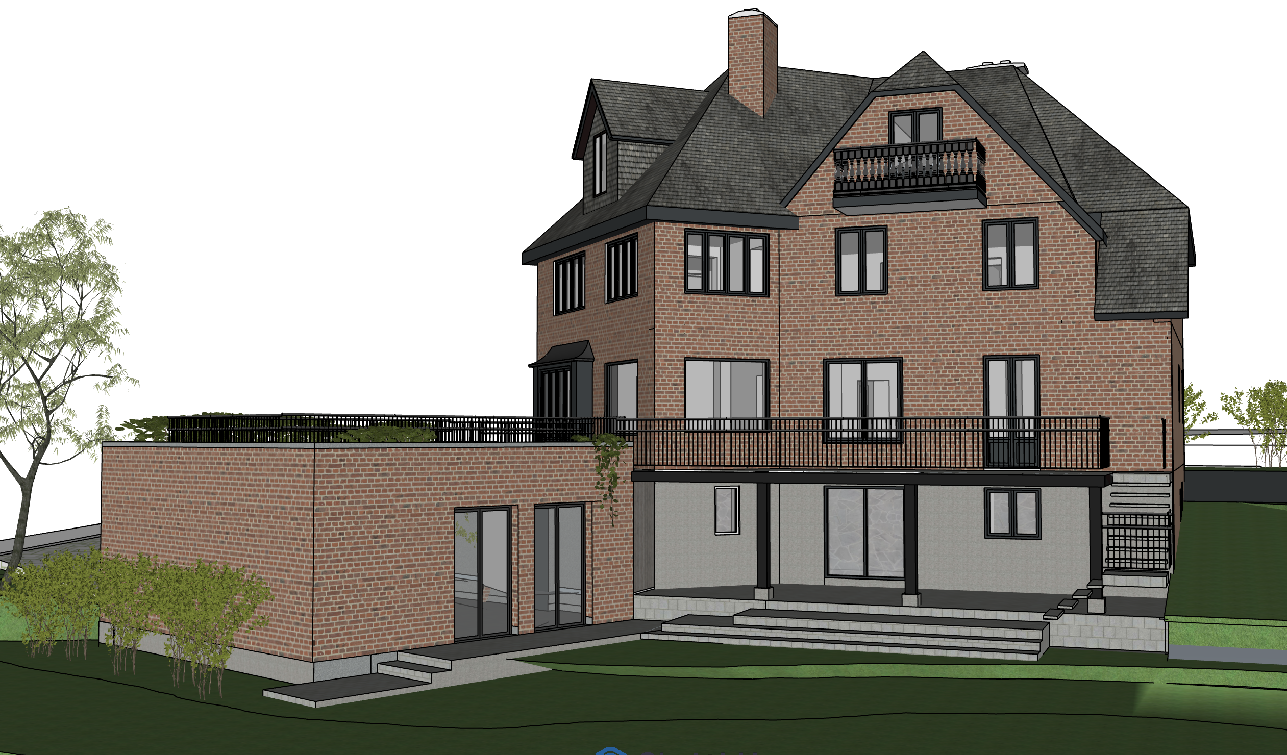 architectural rendering either some realism maintain all materials shown in image provide maintain all geometry from image provided upper balcony on 3rd floor is painted black wood with ornate details as per image provided