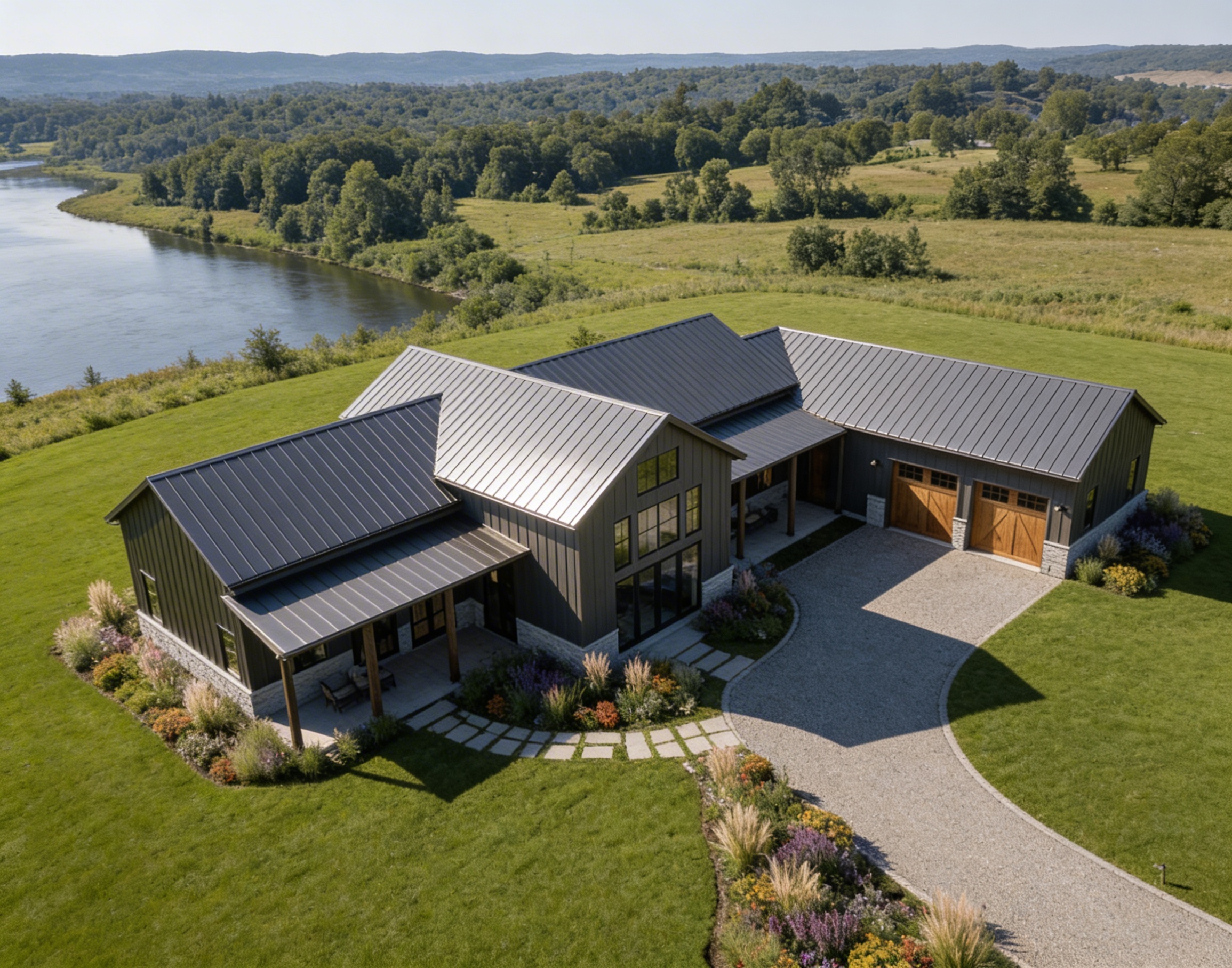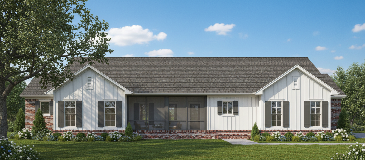 white board and batten siding with dark shutters and shingles red distressed brick 4 5 rows on bottom of house before siding starts this is the rear of the house