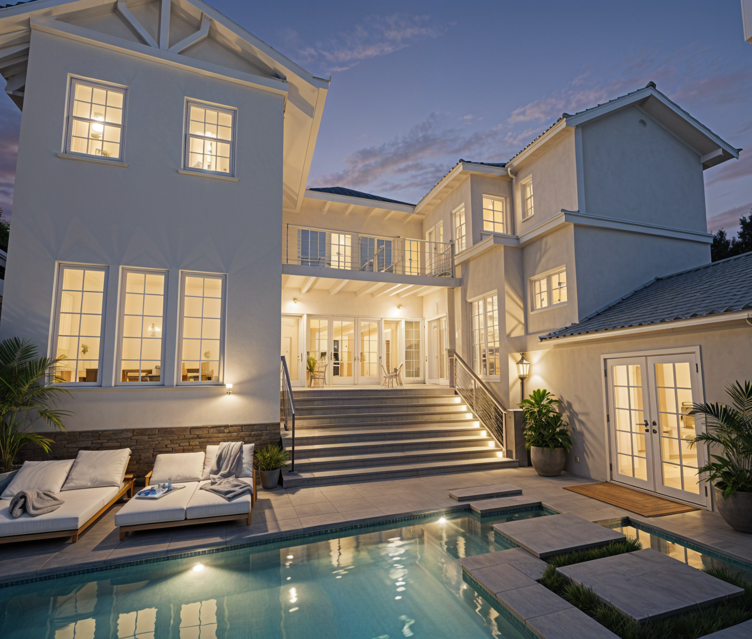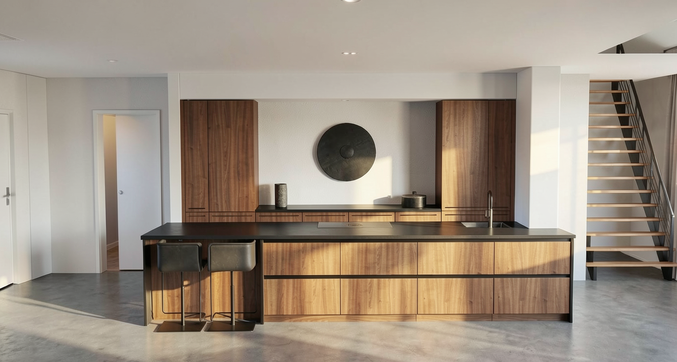 show a nighttime rendering of this kitchen with dim under cabinet light under the bar cabinets and illuminated glass cabinets in the tall cabinetry area the island pendants and ceiling can light on to warm the room with soft light