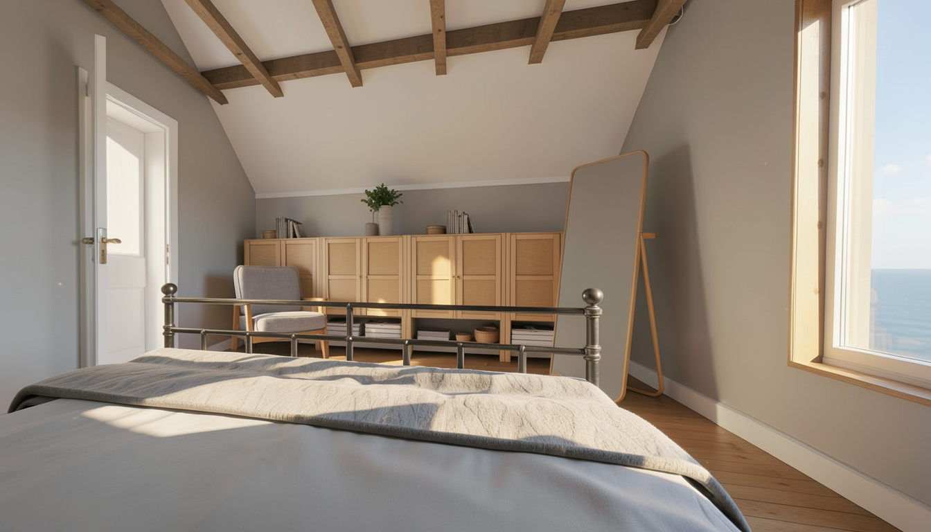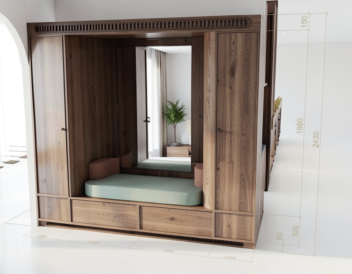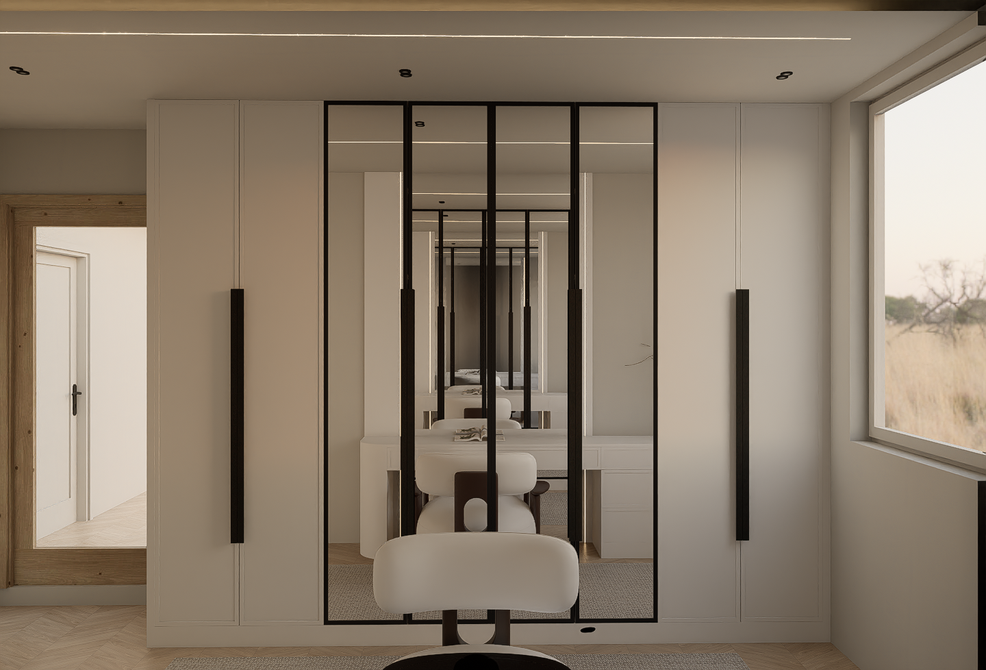 create an ultra photorealistic luxury bedroom dressing area render from this exact camera angle matching the same realism mood and material quality as the other bedroom renders keep the exact original design layout wardrobe proportions mirror door composition vanity placement chair position wall proportions window size ceiling lighting line floor pattern rug placement and camera composition completely unchanged do not redesign move or replace anything make the scene look like a real high end interior photograph physically accurate soft daylight entering from the right window warm ambient interior lighting realistic global illumination bounce light contact shadows and soft shadow gradients premium editorial interior photography feeling subtle cinematic contrast with refined highlights calm elegant minimal luxury atmosphere enhance all materials so they feel truly physical and realistic warm off white or light beige wardrobe panels with smooth matte lacquer finish and soft realistic sheen black metal framed mirror doors with accurate reflections depth and sharp clean edges mirror surfaces must look natural and realistic with proper reflection behavior and depth not artificial vanity in matching light finish with refined edge highlights and realistic surface texture upholstered vanity chair with soft premium fabric texture and realistic rounded form light oak herringbone floor with authentic grain and natural tonal variation rug with realistic woven textile texture and soft thickness wood door frame on the left should look natural and warm with realistic grain and tone variation window frame and wall paint should feel clean refined and real make the mirrored wardrobe section especially realistic accurate reflection of the vanity and repeated depth view realistic black frame finish with subtle satin sheen clean mirror clarity without distortion soft natural highlight response on metal edges refine the styling realism keep the vanity minimal and elegant if visible improve small decorative objects so they look premium and natural do not clutter the space maintain the clean architectural character overall mood ultra realistic warm refined minimal luxurious calm editorial real photo quality interior render negative instructions do not change the design do not move the chair or vanity do not alter the wardrobe layout do not change the mirror frame design do not modify the ceiling lighting line do not change the floor pattern do not add extra furniture do not overcrowd with accessories only enhance realism lighting quality material depth and mirror realism add this ending line too keep the exact original composition and design untouched only improve realism mirror quality material depth and photo realistic lighting