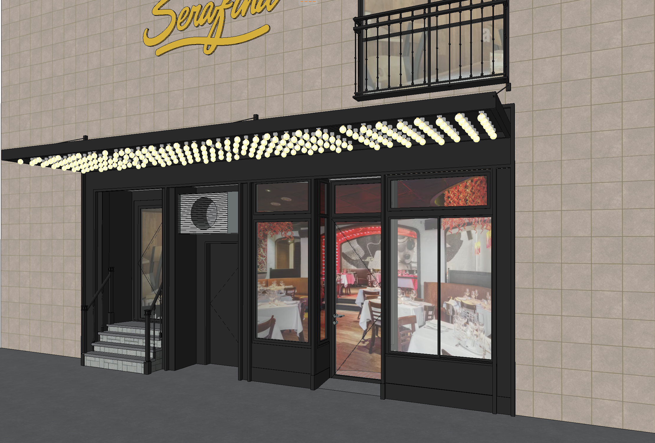 photorealistic render of serafina restaurant facade exact geometry preserved matte black metal facade panels with black metal trim large clear storefront windows with realistic reflections and visible interior black metal awning with evenly spaced glowing bulbs underneath backlit serafina sign above upper windows with black french balconies real new york madison ave 79th st street context neutral daylight ultra sharp material detail