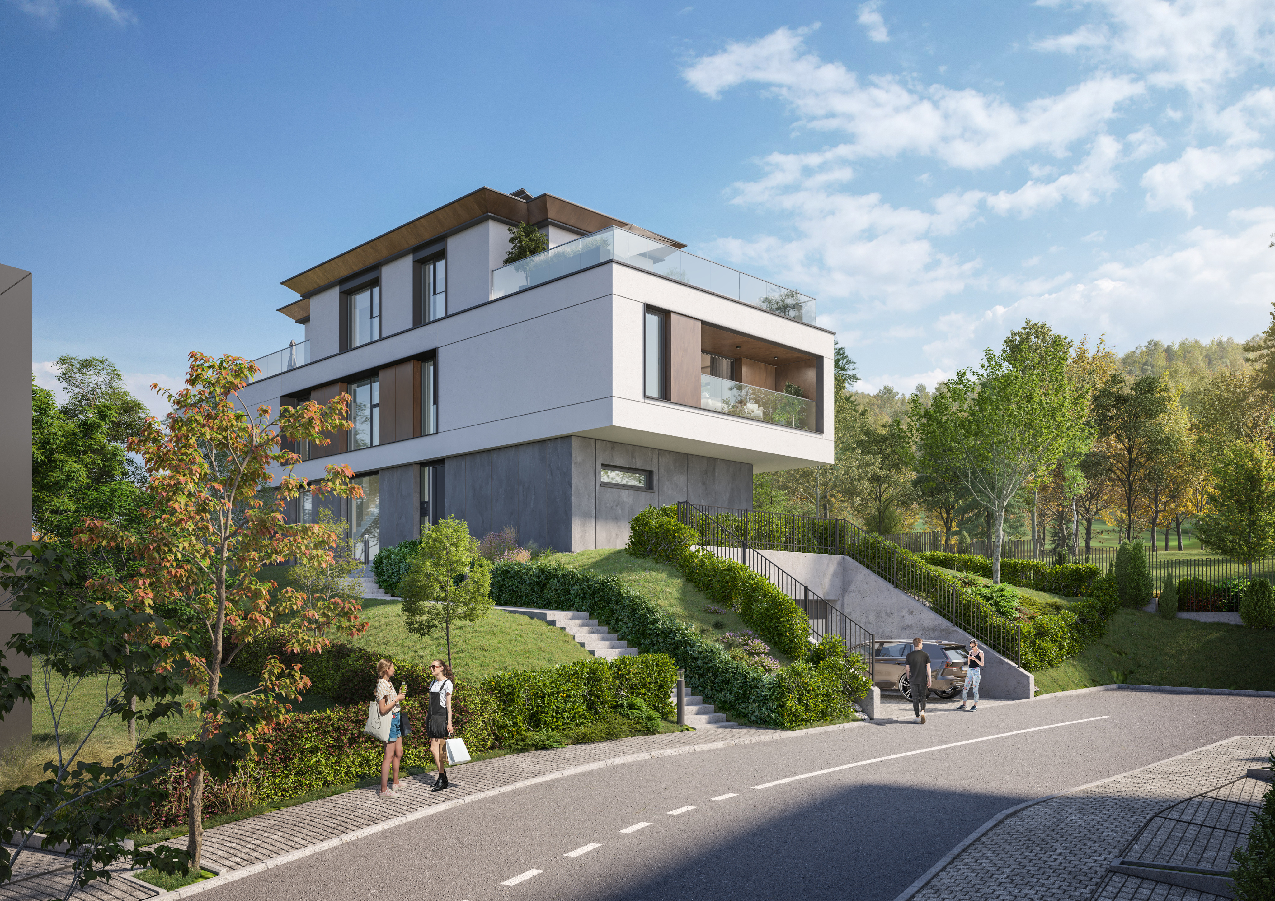 exterior shot use environment and materials from the mood board add road in front of the garage ramp remove the rail from the stairs and add hedges