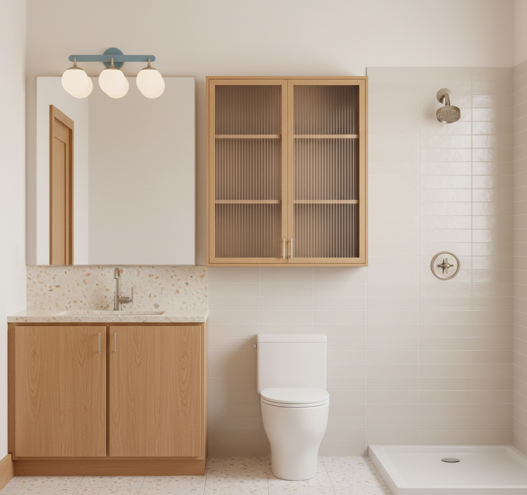 render a modern neutral living room interior with sleek minimalist design maintain all the design and finishes applied in this model use a palette of light oak for the cabinets and shelves balanced with off white off white for cabinet doors the floor is a rich herringbone neutral light wood adding depth and warmth the walls are a soft neutral white to enhance the spacious feel the atmosphere is bright and airy with natural light streaming through a large window and patio door room doors are neutral taupe with black hardware add white vase and green plant on the tv unit decorate shelves add under cabinet lighting add white light filtering blind
