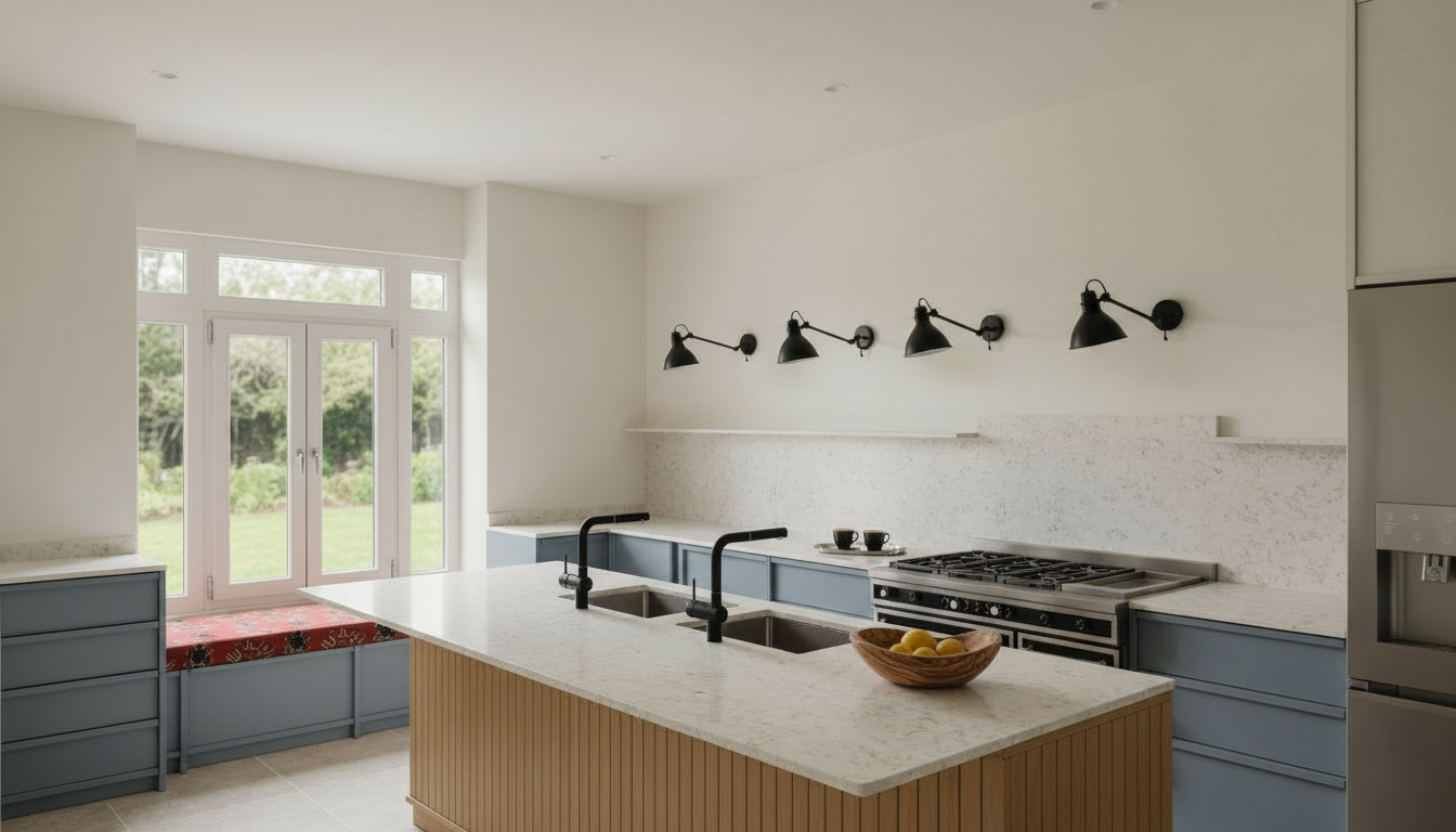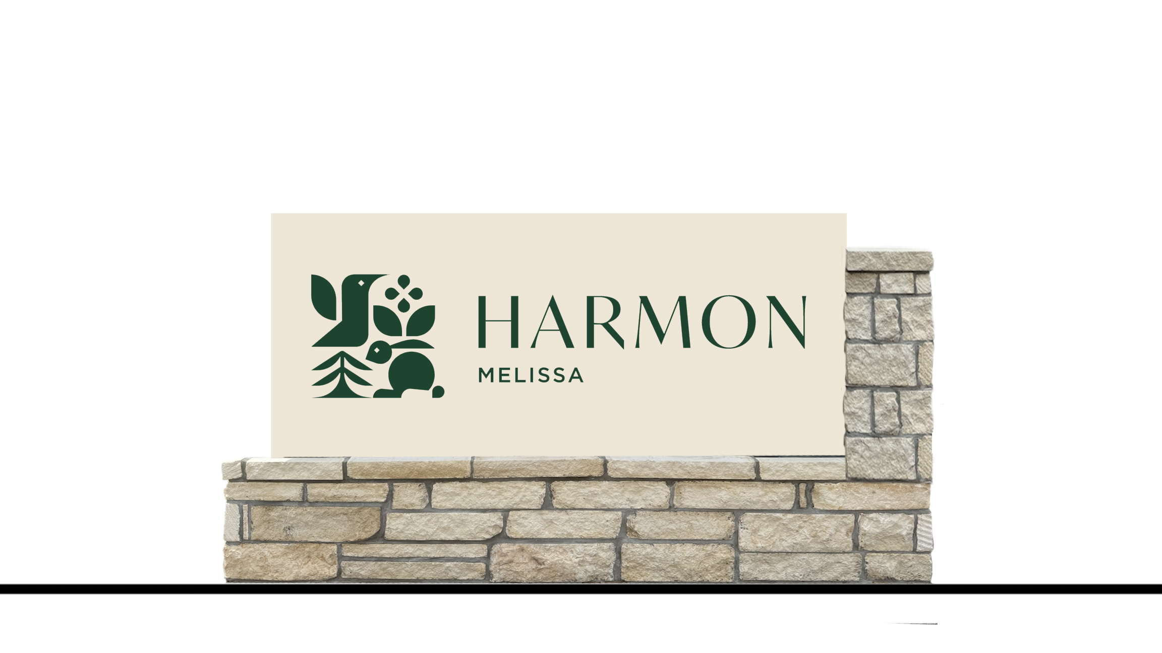 photorealistic entry monument sign stacked limestone base cream panel dark green serif logo flanked by 6 foot tall ornamental trees and 18 tall oaks ornamental giant liriope flowering groundcover warm afternoon light eye level perspective show a street and sidewalk infront