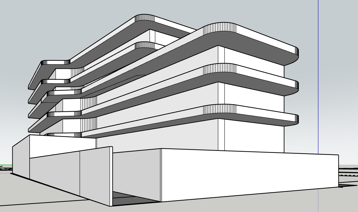 exterior shot render an elegant modernist building with sweeping curved balconies and horizontal lines use sleek minimalistic design with a glass and steel facade balconies should be in a soft gray tone while the main structure is a pristine white the building sits on a light gray base with a spacious open feel surround with a clear blue sky and warm golden light suggesting a tranquil late afternoon atmosphere add subtle green foliage at the base for a touch of nature