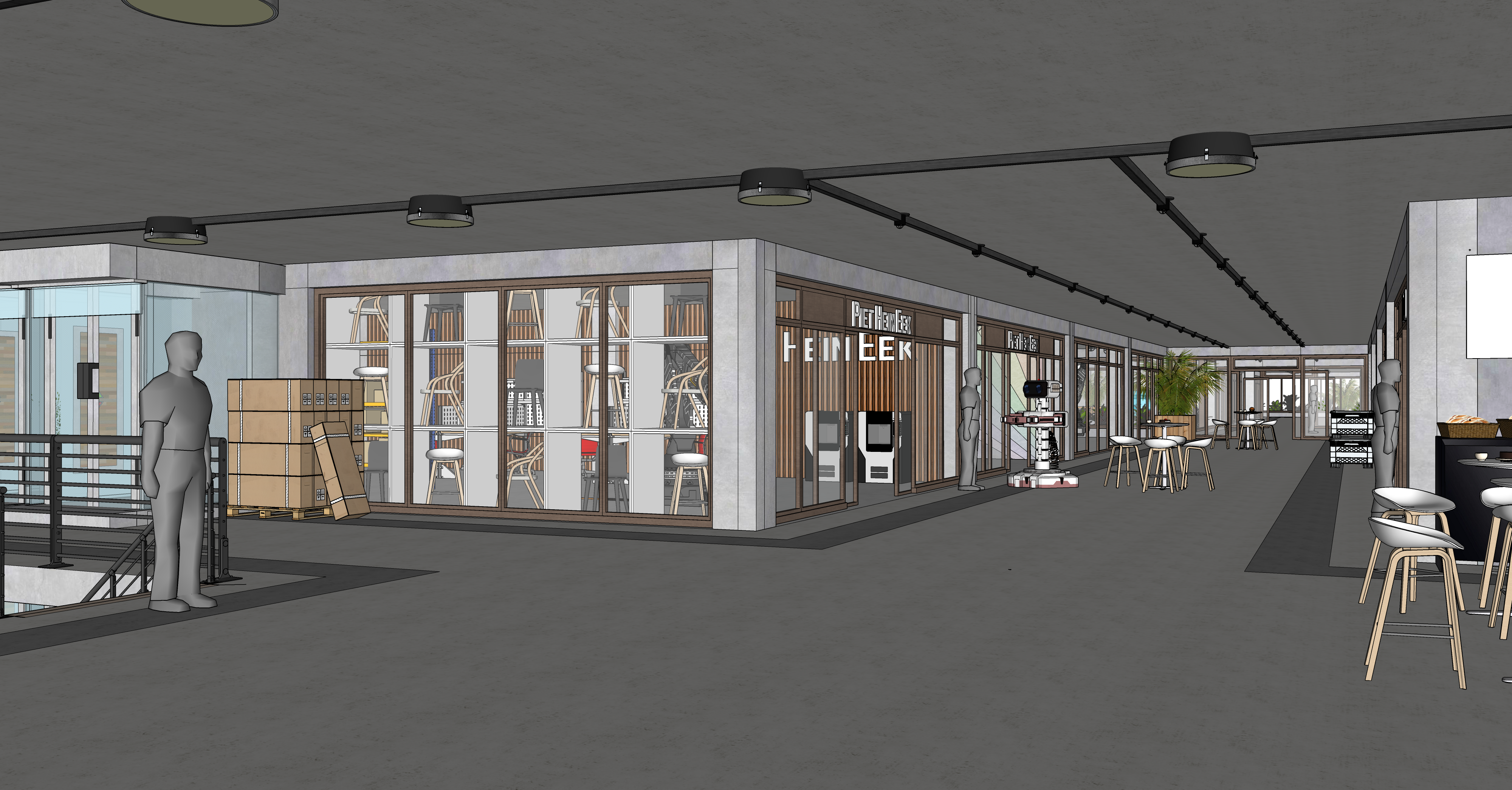 modernist interior shot industrial coworking space wooden details white walls concrete floor warm light ambience architecture