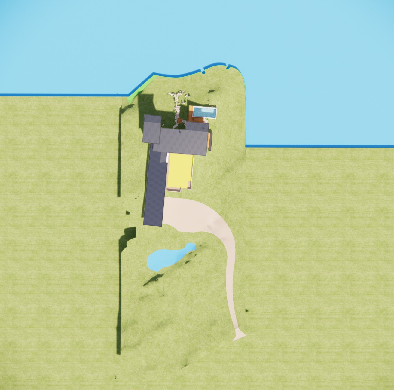 create a photorealistic birds eye view site plan rendering top down high oblique drone view choose whichever matches the reference match the reference image exactly do not alter any geometry green areas are natural native land yellow areas grass lawn mown healthy slightly sun faded late summer tone brown areas brown gravel driveway angular gravel texture realistic compaction subtle tire patterning if shown smaller blue shape natural pond irregular natural edges shallow to deeper gradient natural coloration bigger blue shape at top of image is the lake context location contemporary lakehouse on inks lake texas hill country keep all site geometry and relationships identical to the reference shoreline bulkhead line dock walkway tie in boathouse position house position and any terraces paths shoreline water match reference lake occupies the portion of the frame consistent with the reference plan view water body shape must match exactly calm blue green water at normal level with gentle wind ripples and realistic reflections where visible from above shoreline has a concrete bulkhead with low native grasses immediately above it retain exact bulkhead geometry and alignment architecture do not alter retain the exact structure from the reference window arrangement rooflines foundation height proportions two story portion is a screen porch keep its openness and scale exactly as shown materials white stucco siding light gray standing seam metal roofing exposed timber rafter tails accurate glazing with realistic reflections no warped fenestration dock boathouse boat include a boathouse connected to the shore via a dock walkway tied into the bulkhead exact placement per reference place one boat in the water near the boathouse floating naturally with minimal disturbance small ripples consistent with calm conditions keep relative position consistent with the reference topography planting use reference topo lines use the topo lines from the reference to build an accurate site behind the bulkhead no smoothing no reinterpretation minimal site disturbance native drought tolerant hill country landscaping and natural pathways planting scattered live oaks ashe juniper dry golden grasses with occasional green pockets prickly pear accents only where consistent with the reference lighting atmosphere render quality lighting late summer afternoon sun position top left shadows cast bottom right physically accurate direction intensity subtle atmospheric depth warm haze over distant low hills if visible hyper real architectural visualization high micro texture detail stucco metal seams wood grain concrete bulkhead gravel balanced hdr crisp edges crisp shadows vibrant clear sky if included output 8k photoreal render plan site emphasis no diagram styling not flat vector realistic materials and light