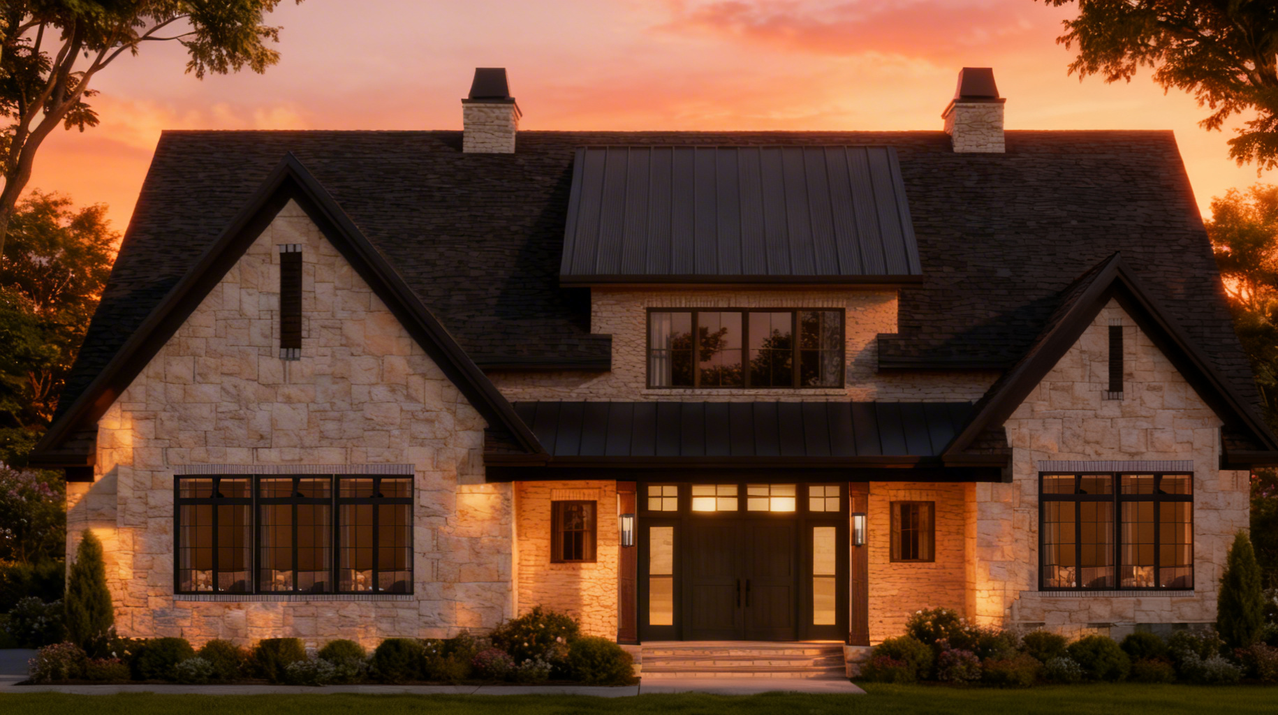 turn into a render landscaped a couple of people at the front door no landscaping plants ontop of the building