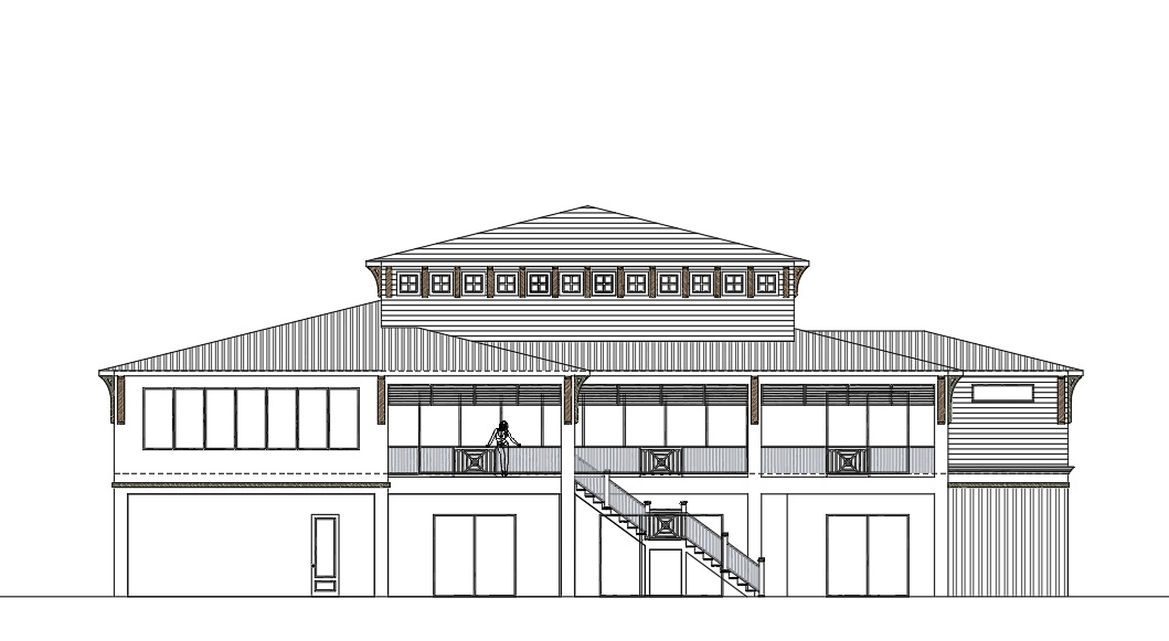 a modern farmhouse white and with metal dark gray roofing the decorative wall brackets are in walnut brown mouldings are in white color railings are traditional southern cross coastal design railing the upper exterior walls has white hardi plank horizontal exterior walls surrounded by lush greenery in florida setting at the rear surround it with palm trees and a dawn setup with lights lit up there is a swimming pool with jacuzzi in front of the stairs around 4 ft distance with a big wide front yard