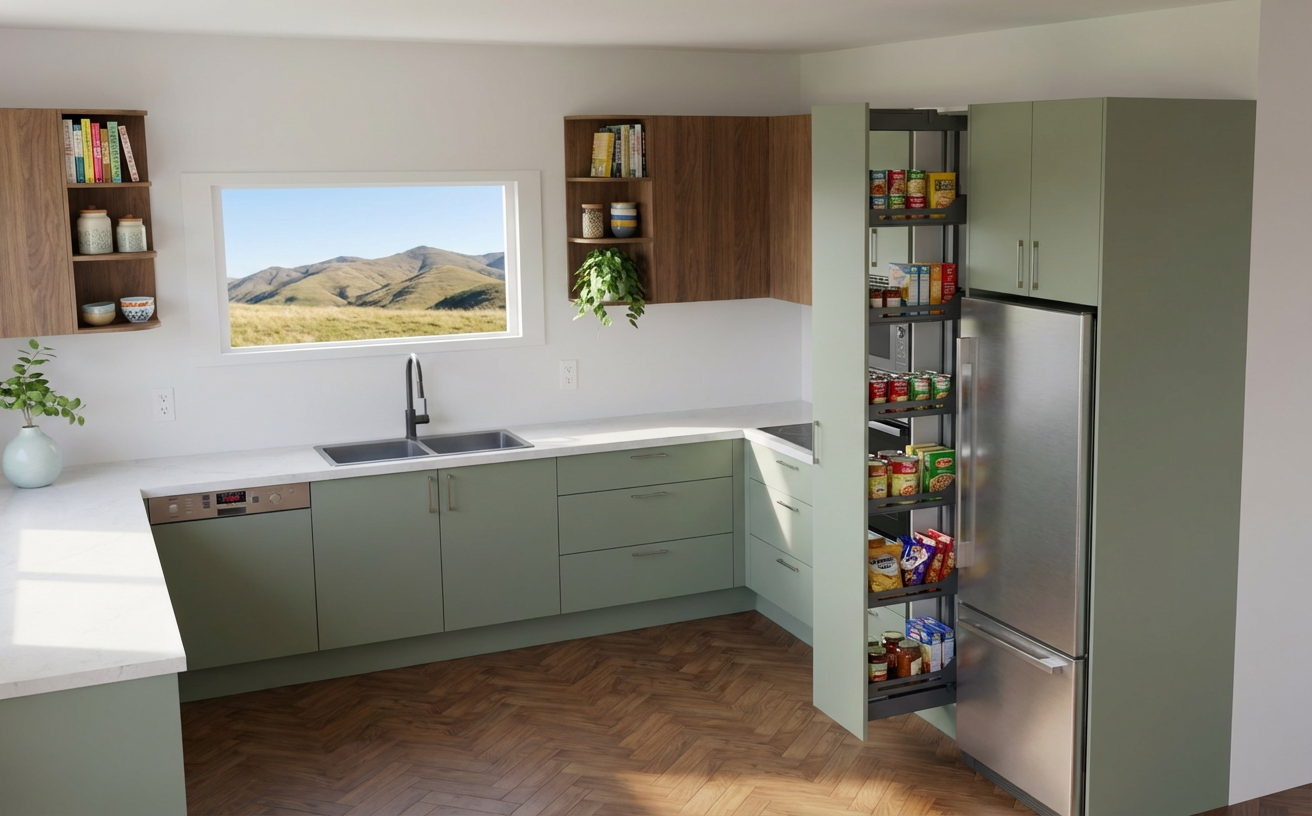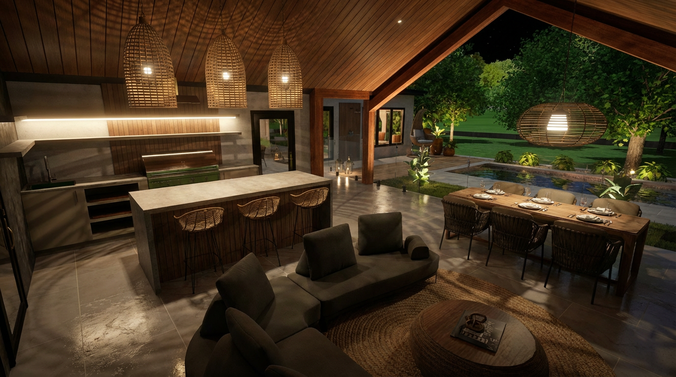 render this with by replacing the sofa on the right side of the seating area with two barrel outdoor chairs instead replace the green with brown painted cabinets on the right hand side with brass hardware and the wood on the inside walls just a bit darker in tone