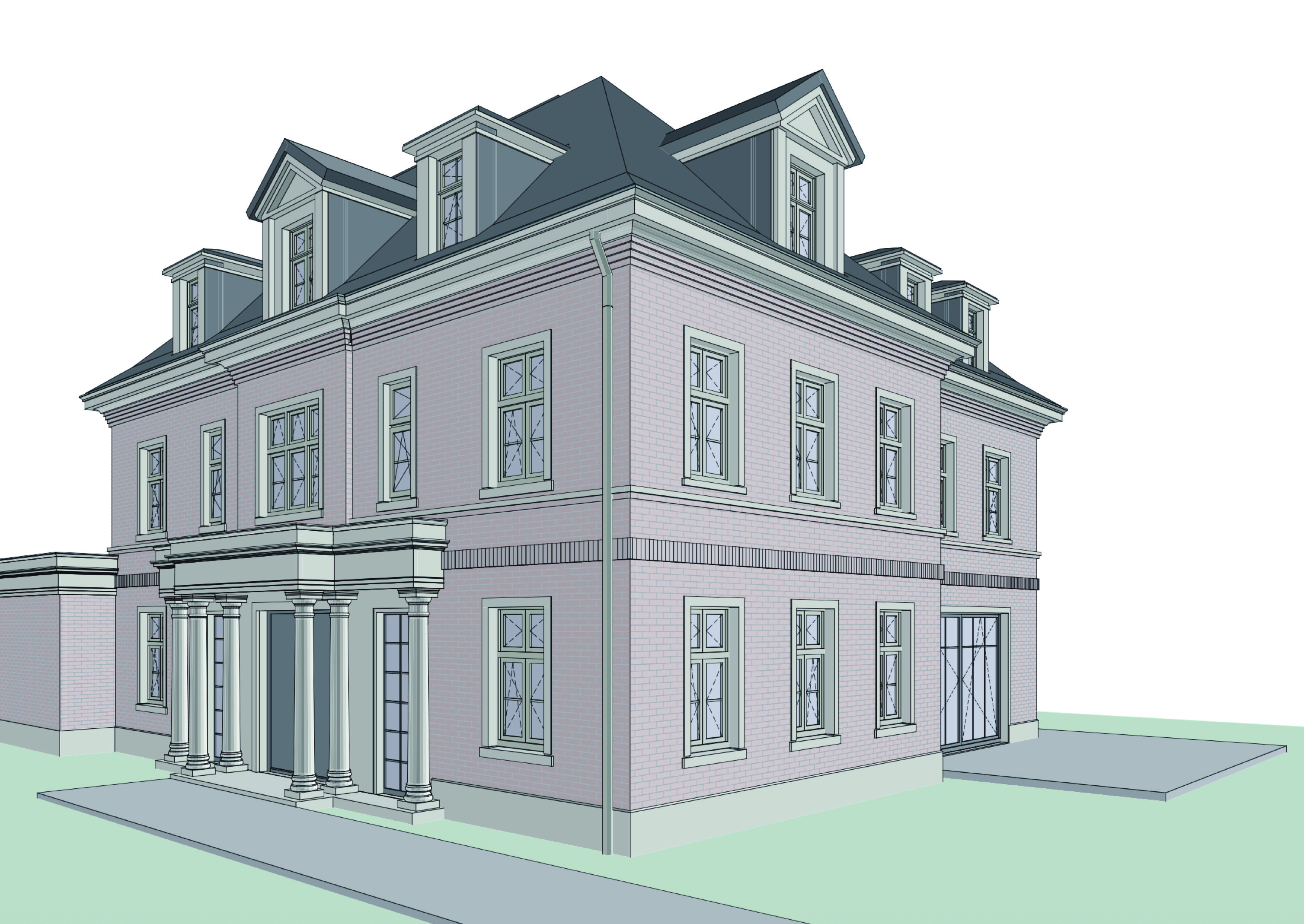 exterior architectural visualization of a classical hamburg residential building a high quality photorealistic rendering of a representative brick villa inspired by classical northern german residential architecture typical for hamburg neighborhoods such as harvestehude or rotherbaum facade warm red to red brown brick masonry precise brickwork horizontal cornice bands subtle fa ade articulation clean edges and calm symmetry architectural character classical elegant restrained timeless solid no exaggerated historic ornamentation no expressionist elements entrance and details representative entrance with classical columns or pilasters well proportioned understated and dignified roof pitched roof with dark clay tiles or slate dormers with clear geometry clean eaves visible metal gutters windows tall vertically proportioned windows with dark wood or metal frames deep reveals traditional rhythm and proportions materials realistic brick surface with subtle color variation and natural aging no artificial smoothness surroundings generous green lawn mature deciduous trees park like setting subtle walkways made of concrete or natural stone a few people for scale not dominant lighting natural daylight sunny conditions with soft realistic shadows calm architectural photography no dramatic or cinematic lighting style timeless high end calm realistic like a professional architectural photograph of a built project preserve all geometry openings and proportions from the sketch only enhance materials lighting environment and realism