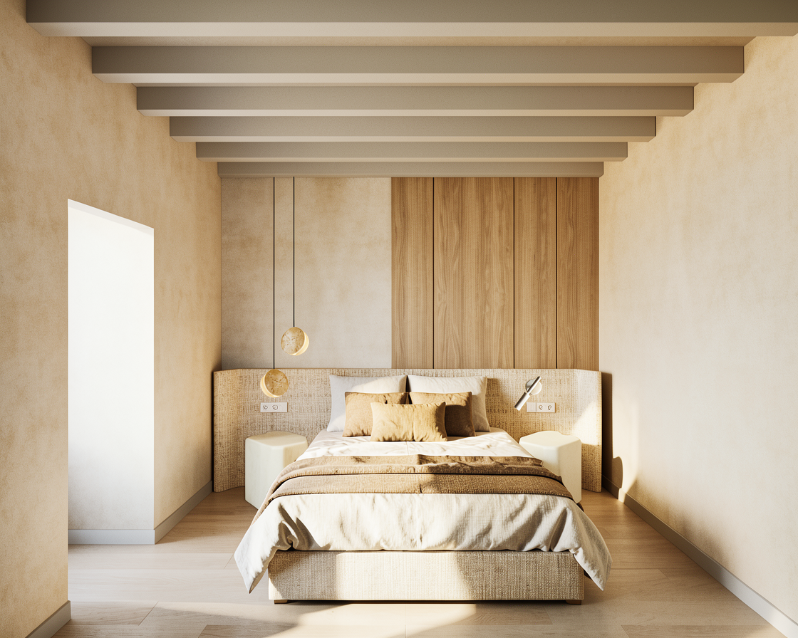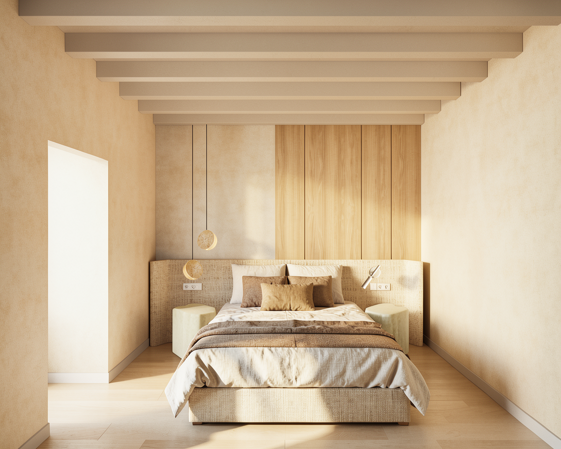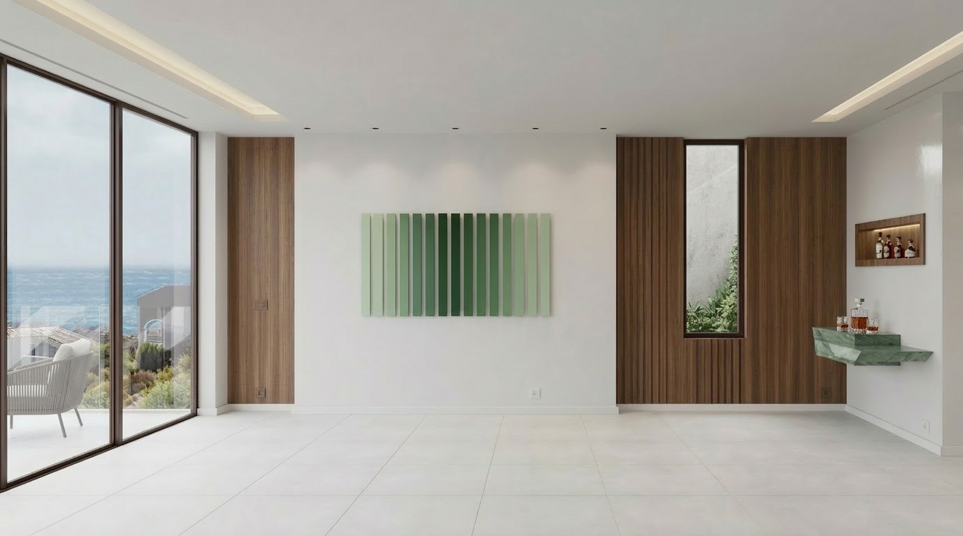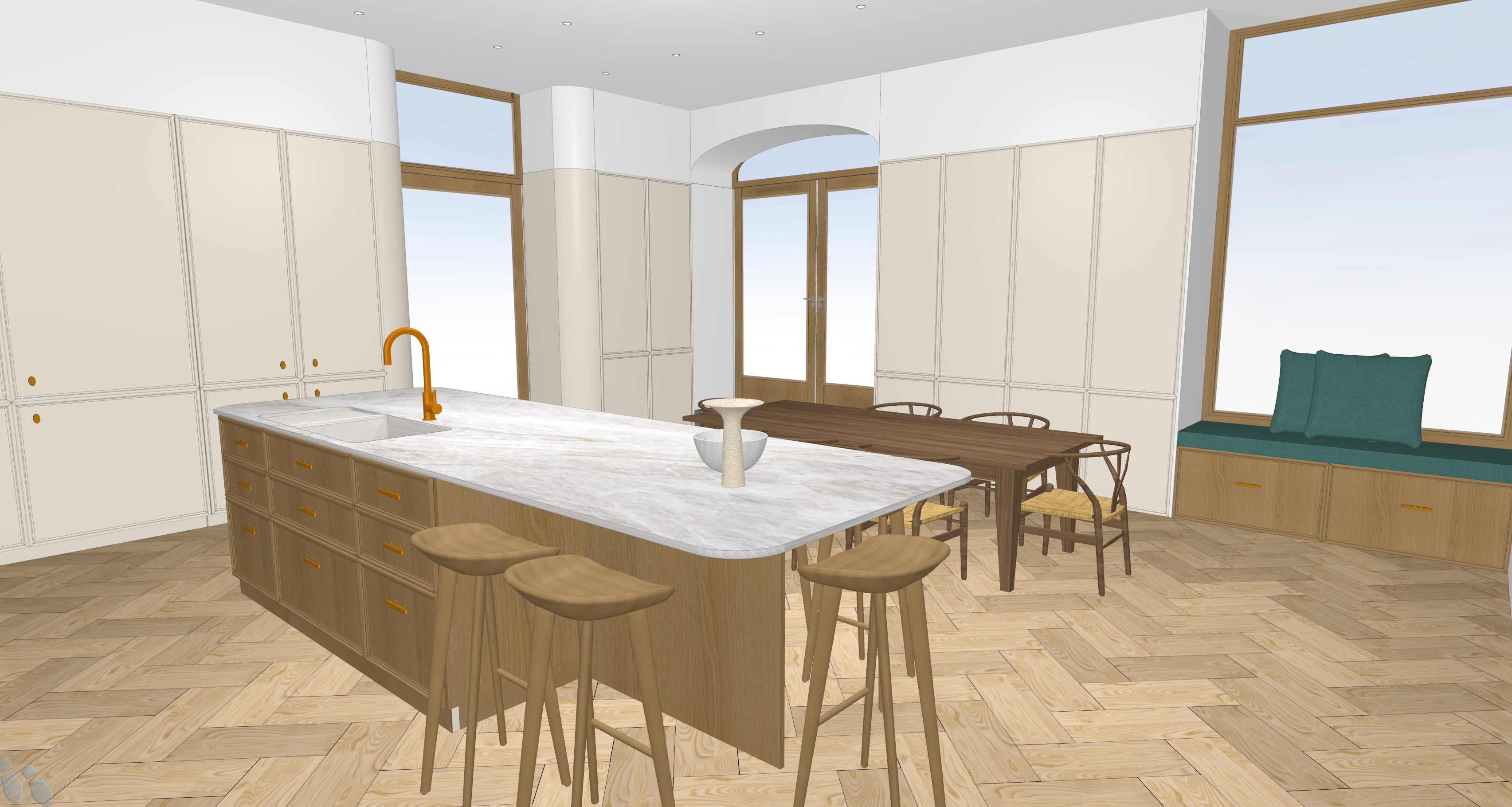 create a serene and elegant kitchen scene with a modern european touch the kitchen should feature a large marble island with a white and grey streaked surface paired with light oak wood cabinetry the cabinets have brass handles offering a touch of sophistication include sleek bar stools with light oak legs and curved seats the flooring is herringbone patterned light oak wood providing warmth walls are painted in soft off white enhancing the natural light streaming through large windows framed in light oak add a cozy teal cushioned window seat with beige base cabinets the dining table is dark walnut with matching chairs having wicker seats the overall atmosphere is bright airy and inviting capturing a peaceful morning ambiance