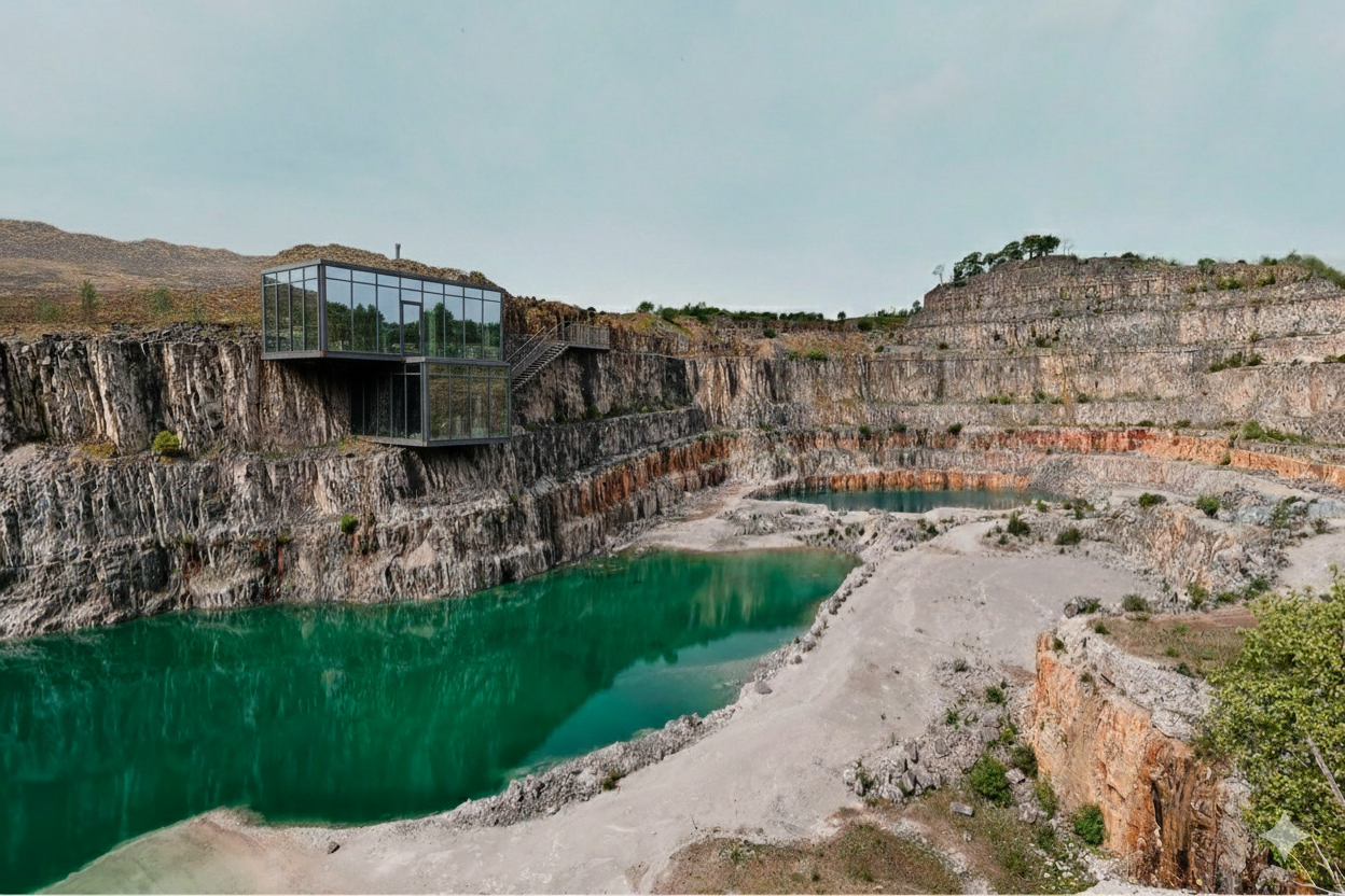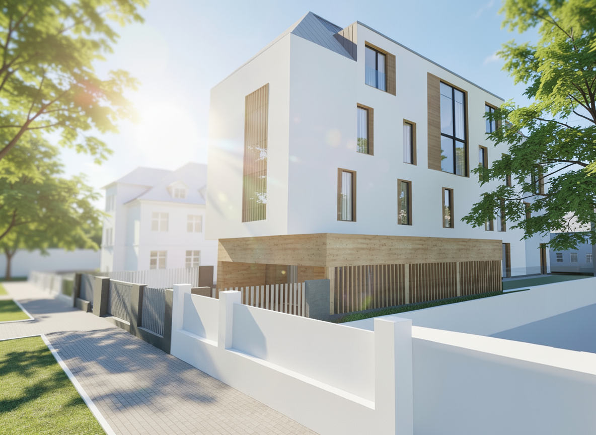 make this building timber and add terraces to roof and side of bottom building add some architectural flare and some people