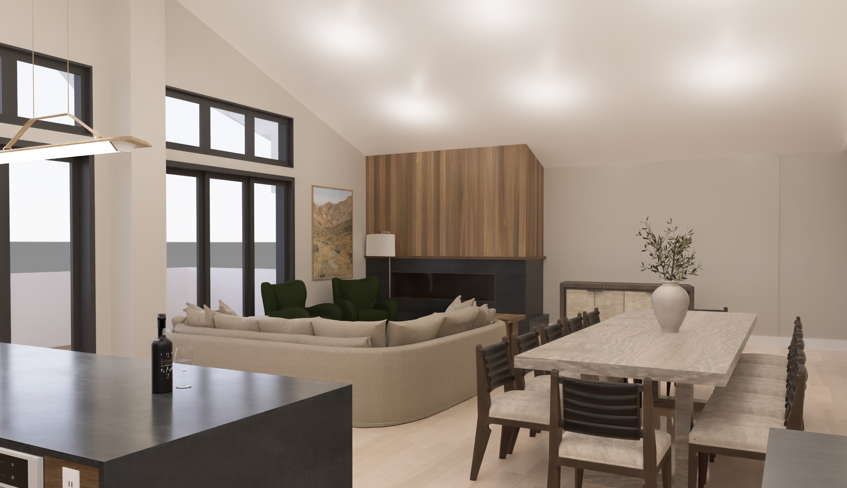 turn this rendering into a photo realistic image with a view outside of the windows to the left a pine tree and aspen forest make the deck railing outside black add recessed lights to the ceiling