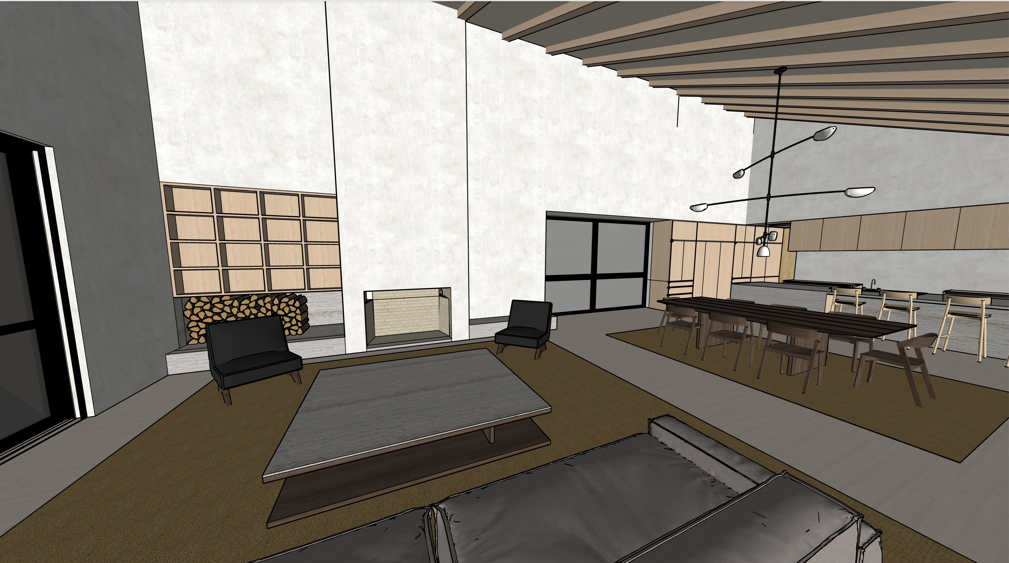 modern serene living room and kitchen with a shed roof applied natural stained white oak beams applied natural stain fir ceiling planks and a white oak cabinets bookcase firewood holder kitchen cabinets with integrated drawer pulls as shown and a stainless steel countertop as shown the floor is natural stain fir planks walls are a cream plaster fireplace hearth is a natural stone light fixture as shown in burnished nickel