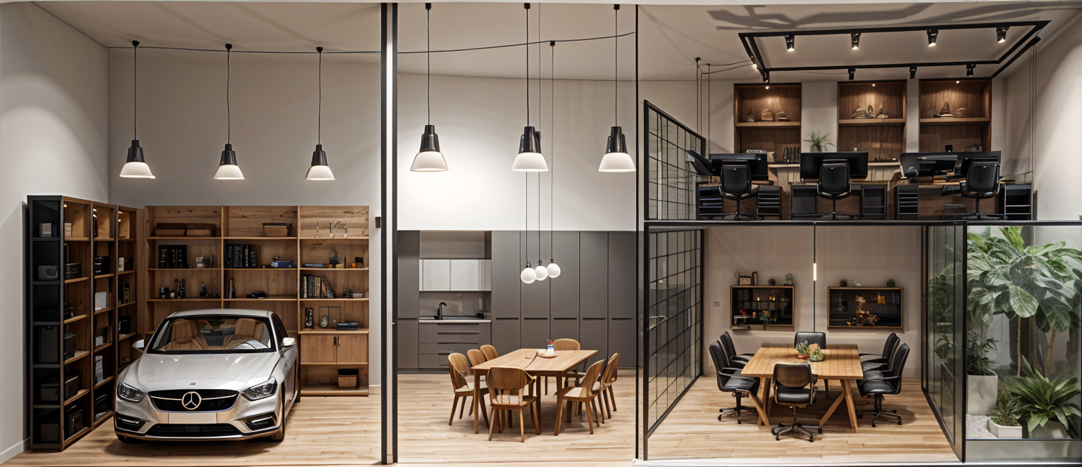 there are no shelves in the conference room the conference room has stock market tvs the shelves in the garage where the car is holds camping items the desks that are upstairs have computer screens