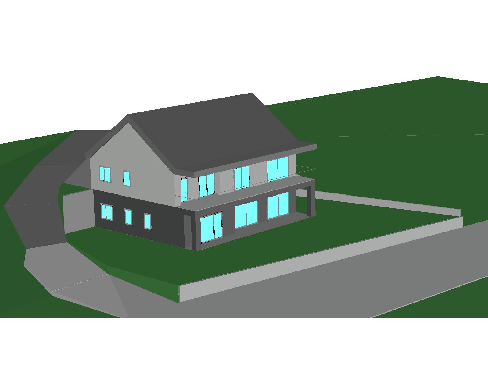 exterior shot white facade grass trees in the background no buildings more natural windows grey window frames summer vibe road below architecture
