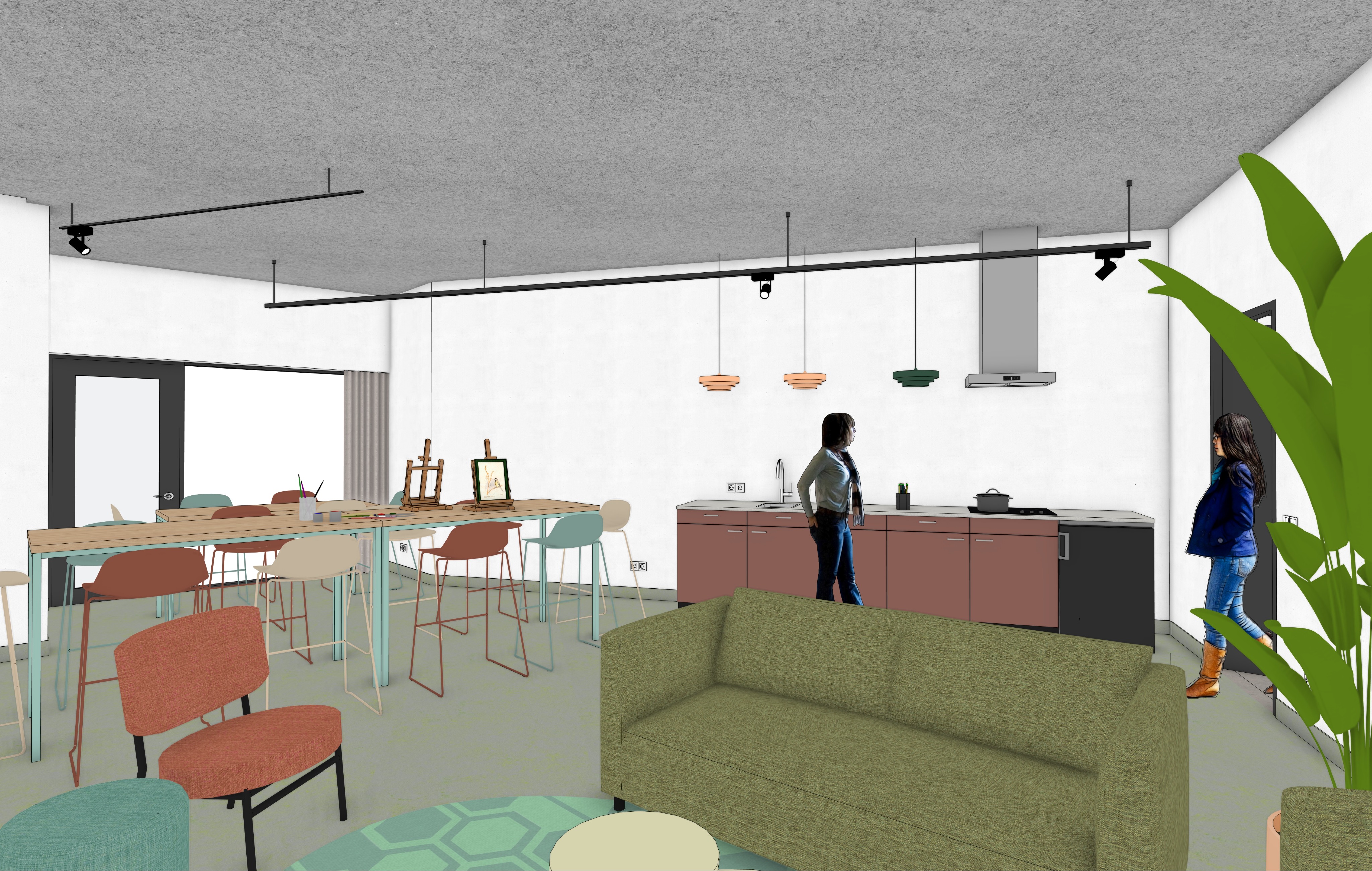 maintain all colors natural daylight ground floor bushes turn the lights on table tops are h3170 from egger blue table frame is ral6034 kitchen is rusty red from egger make the people as realistic as possible