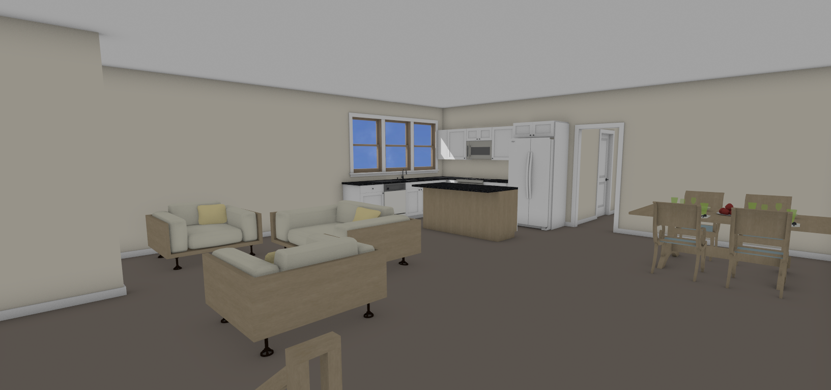 a high resolution photorealistic rendering of a modern open concept living room dining area and kitchen the space includes a sofa set with neutral upholstery and light wooden frames a small coffee table a dining table with chairs and a contemporary kitchen with white cabinets a refrigerator built in microwave and a central island with a dark countertop the layout furniture placement and room dimensions must remain identical to the original design large windows look out to a lush dense forest with tall green trees where bright sunlight filters through the branches casting natural light and soft shadows into the room materials should look realistic detailed wood grain textured fabric polished countertops and reflective glass the atmosphere should be warm inviting and vibrant