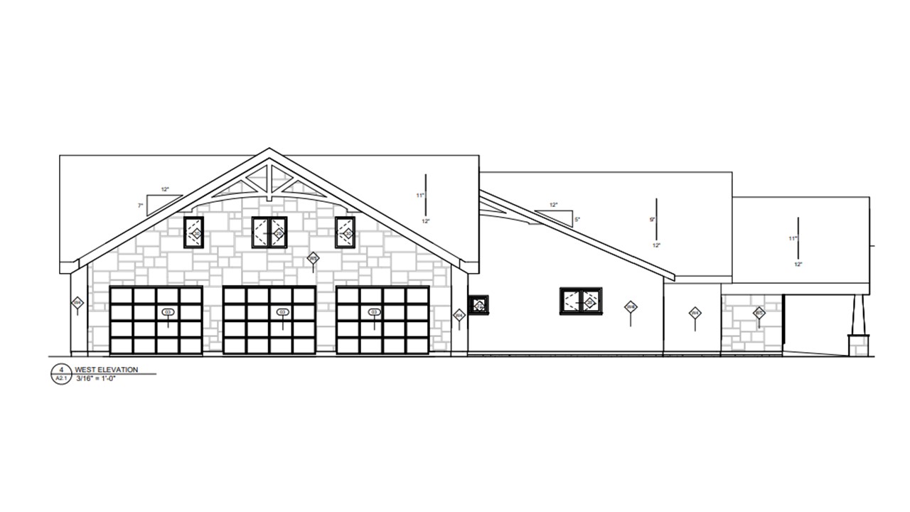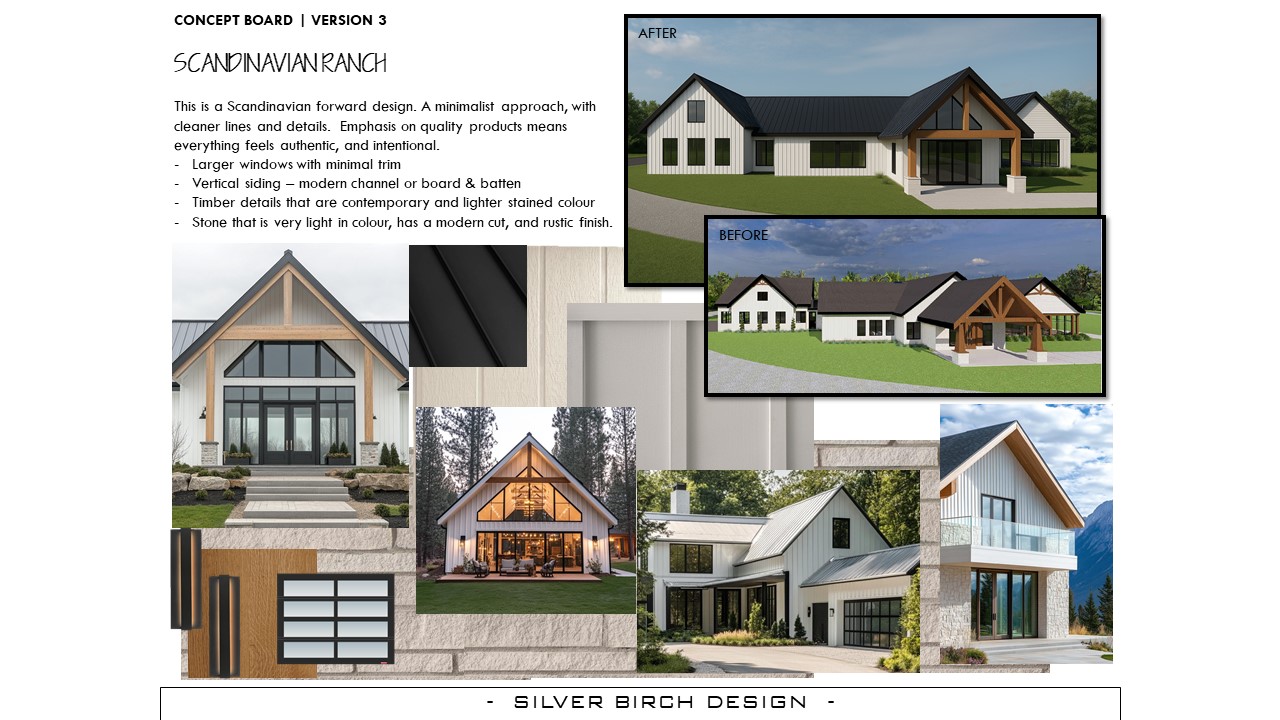 exterior shot black windows black shingle roof black soffit black eaves black fascia on garage elevation only there is light grey stone rest of siding on house is white board and batten timber detail in gable is king post and cross tie only modern sconce lights between garage doors garage doors glass with black frames