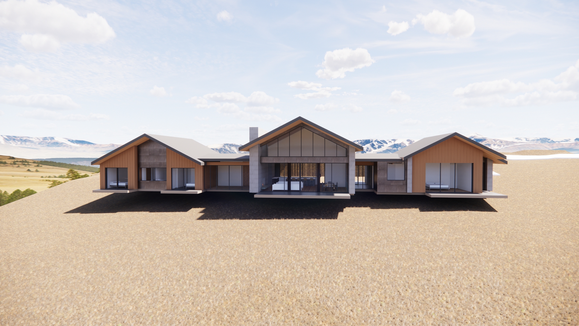 winter scene ridge behind house with sparse pine trees foreground brush and rocks in snow glowing light from interior