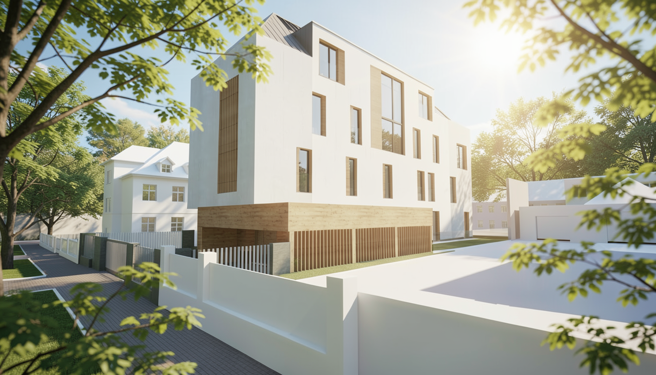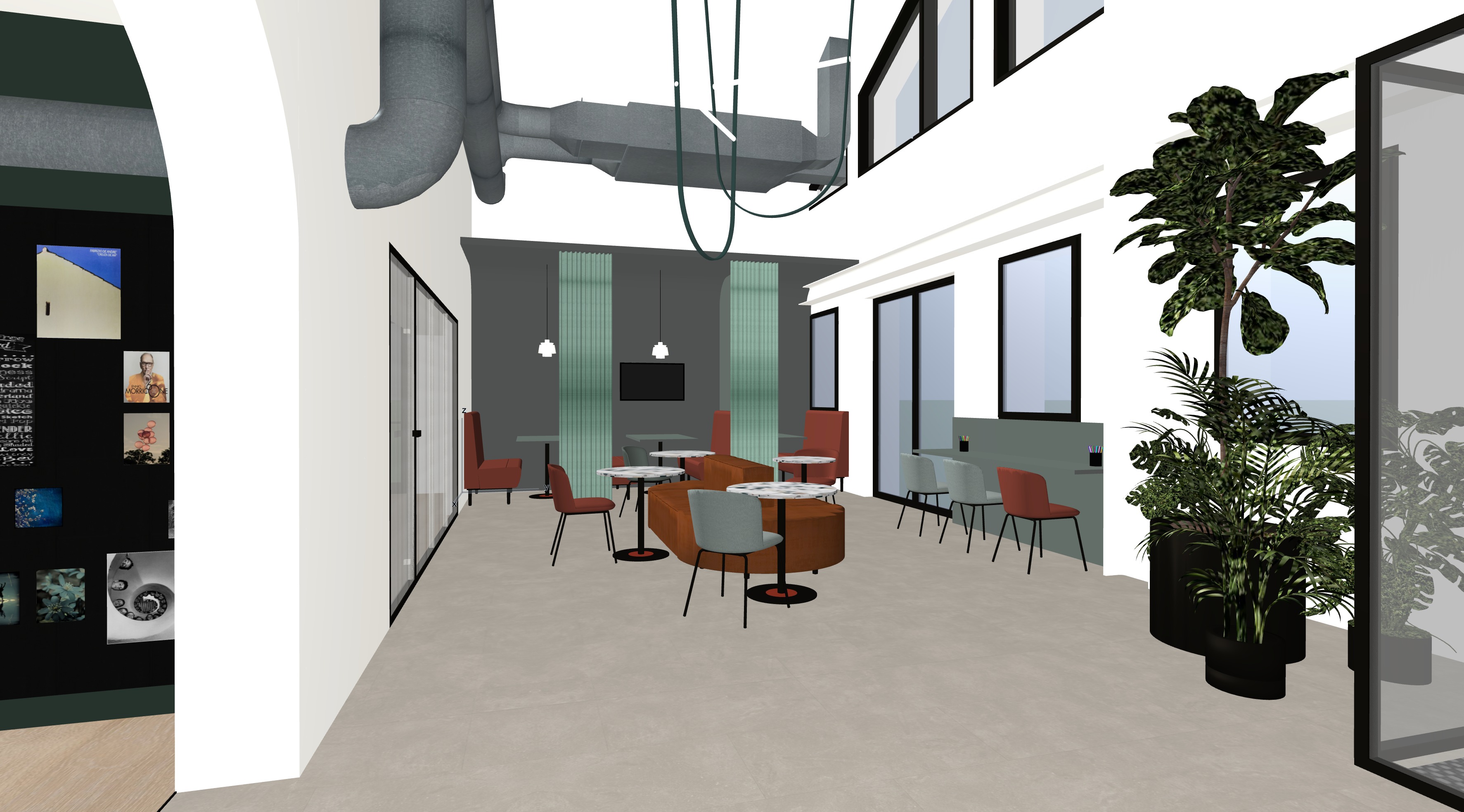 a terra abbiamo un pavimento in linoleum beige chiaro vetro cannettato riflettente fai entrare un p di luce naturale con panorama sul verde