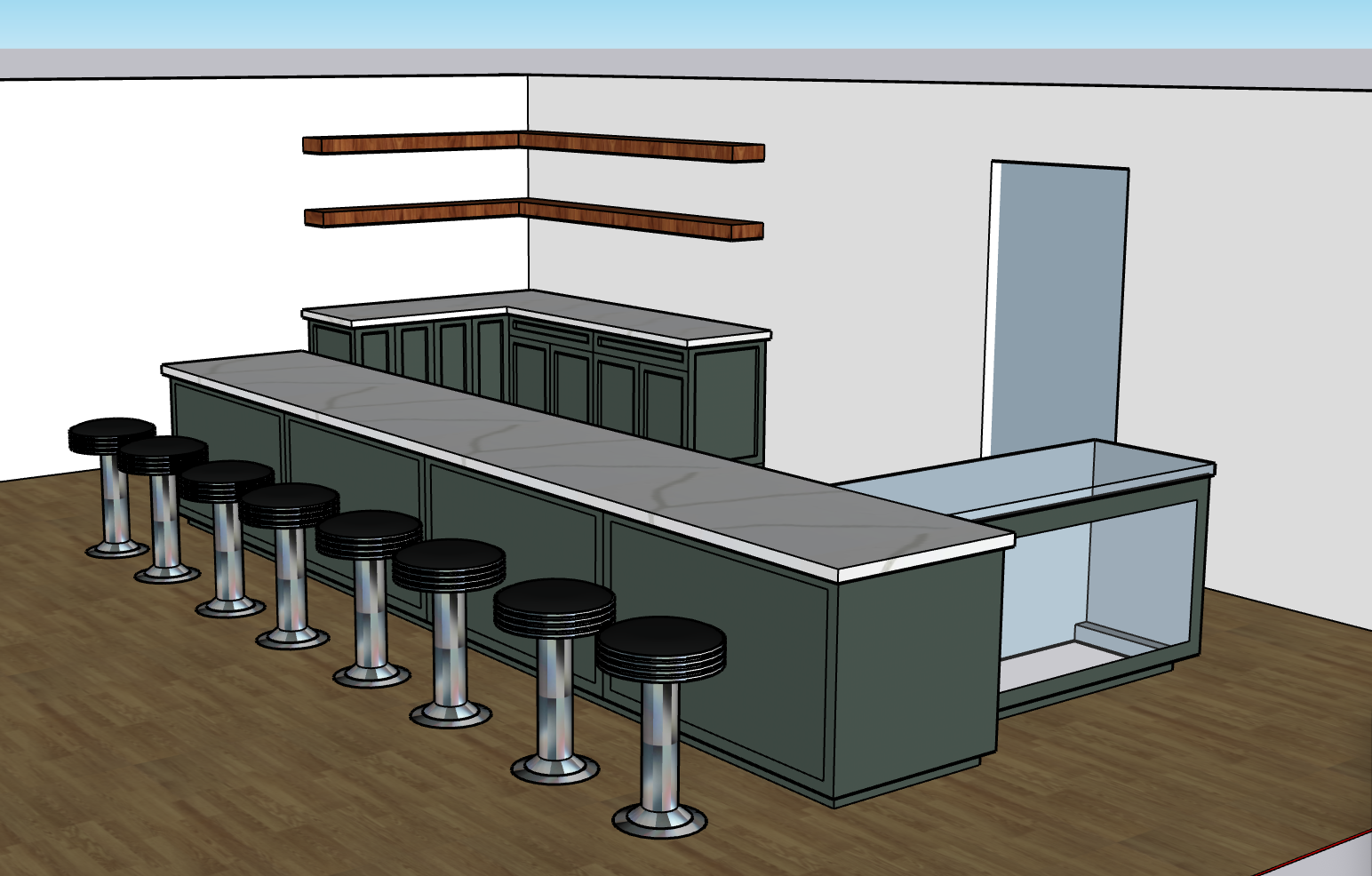 interior shot please maintain the glass top and front on the small peninusla cabinet as shown the stools are vintage diner stools with shiny chrome on the body and black leather on the seats