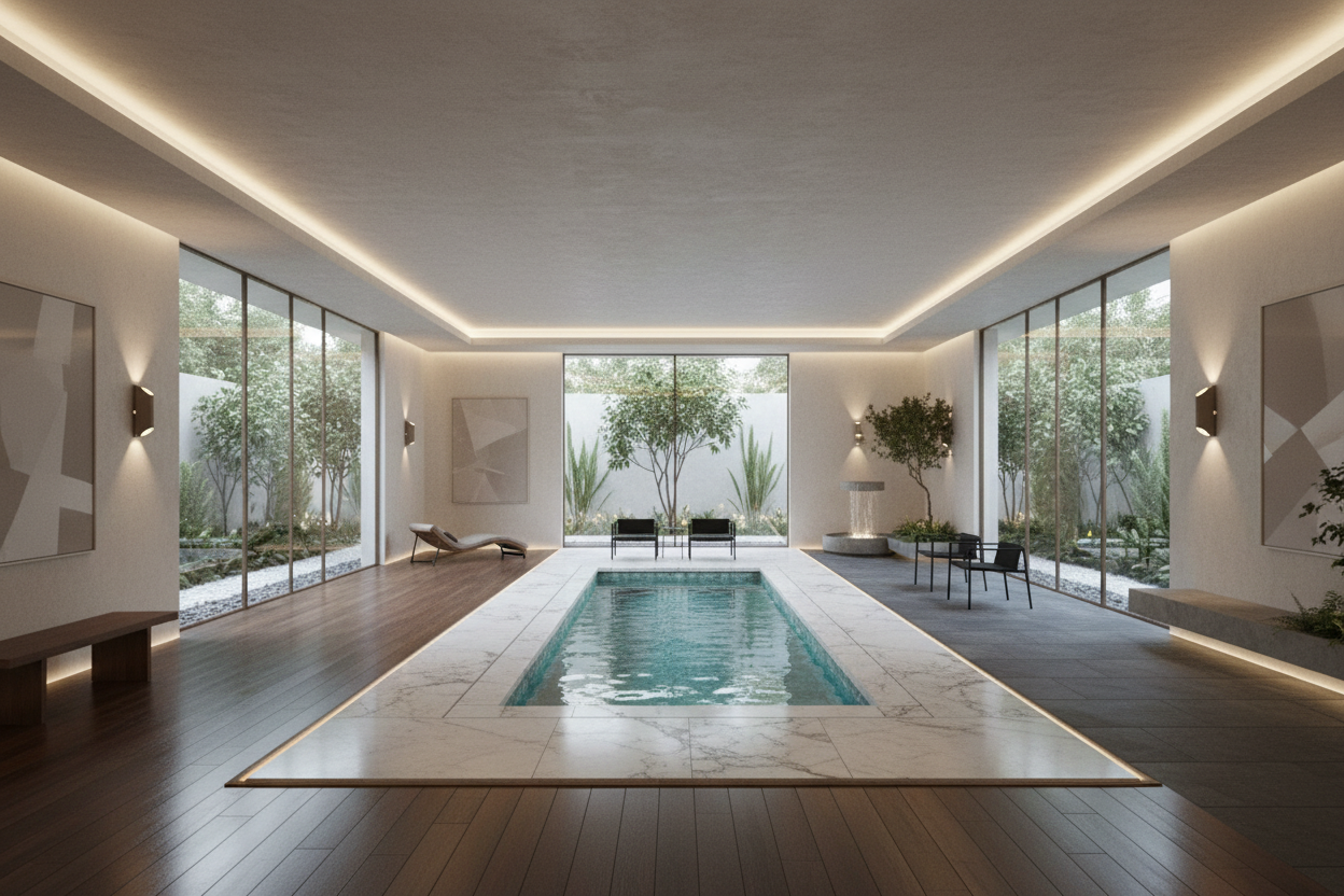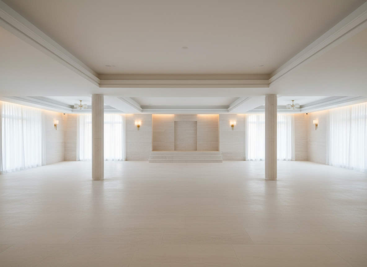 robert a m stern interior shot keep perspective as is event room no furniture windows on the far left and far right walls featuring an elegant stage with 3 steps atmospheric backlight the room lighted with elegant artificial light all finishes in neutral tones simliar to white alabaster architecture